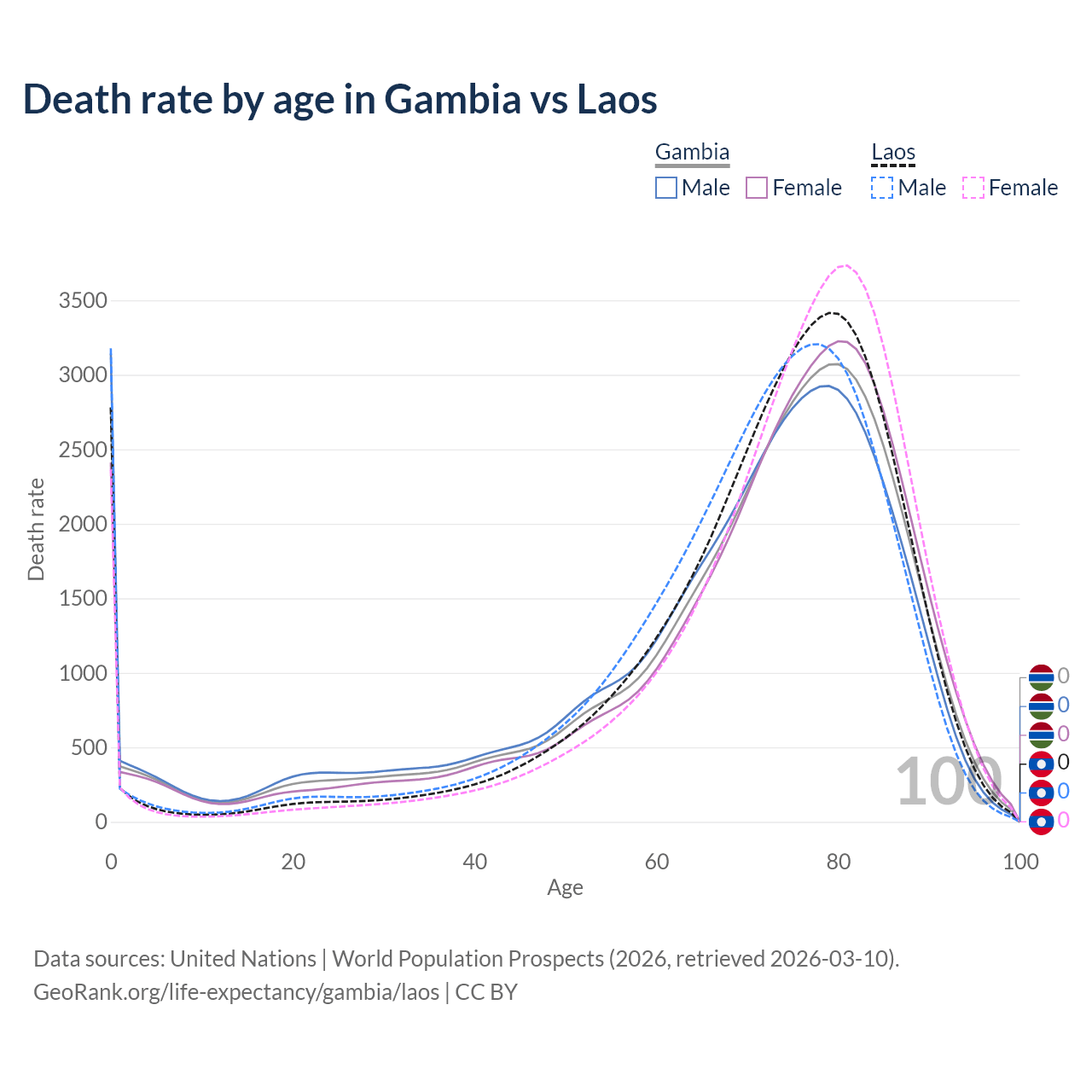 In the Gambia, the most common age of death is 80, compared to 79 in Laos. The median age of death is 73.4 in the Gambia and 74.7 in Laos, meaning only half of each cohort is expected to live past that age.