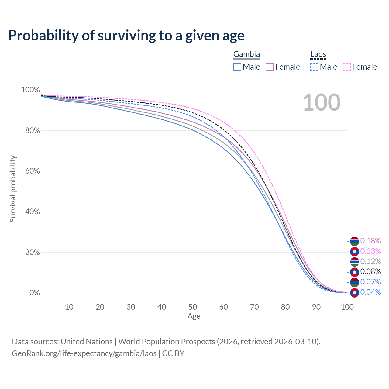 This life expectancy calculator shows the odds of living to 100, 95, 90, and below based on current age for both males and females in the Gambia and Laos, along with mean and median age of death. The calculations are based on the 2026 life tables (actuarial tables) from the UN World Population Prospects.