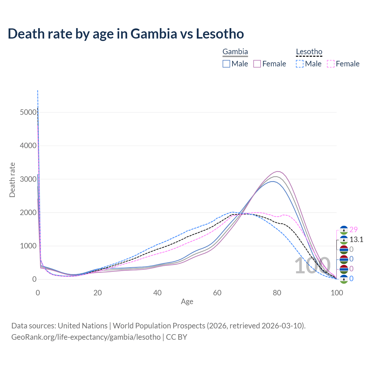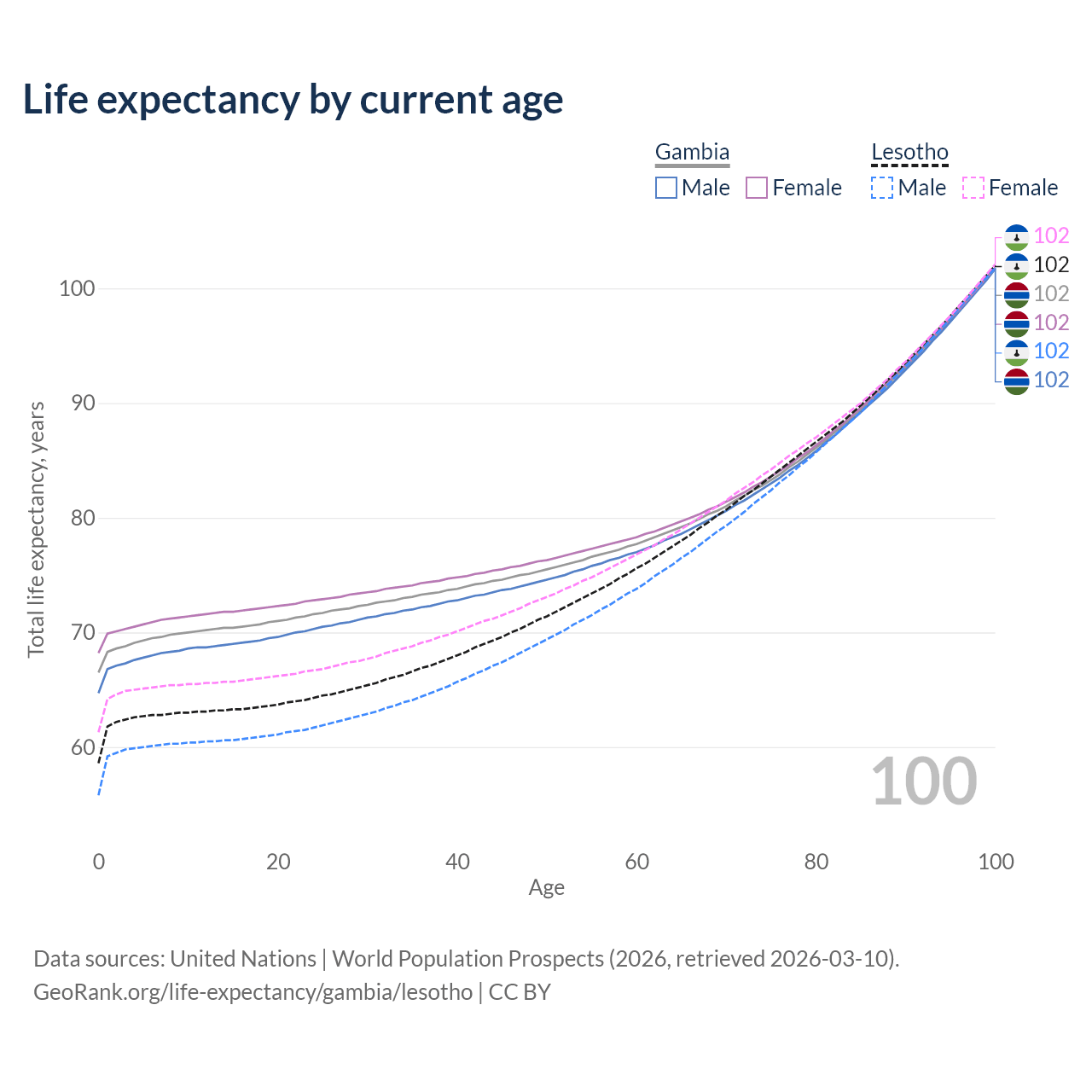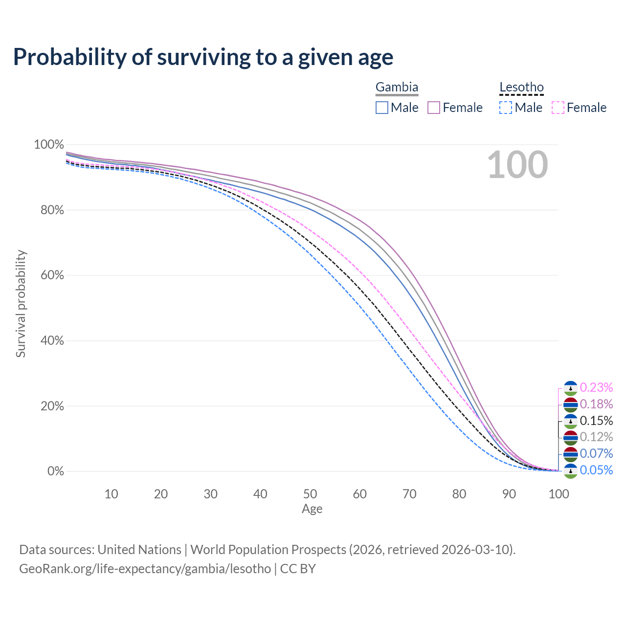 This life expectancy calculator shows the odds of living to 100, 95, 90, and below based on current age for both males and females in the Gambia and Lesotho, along with mean and median age of death. The calculations are based on the 2026 life tables (actuarial tables) from the UN World Population Prospects.
