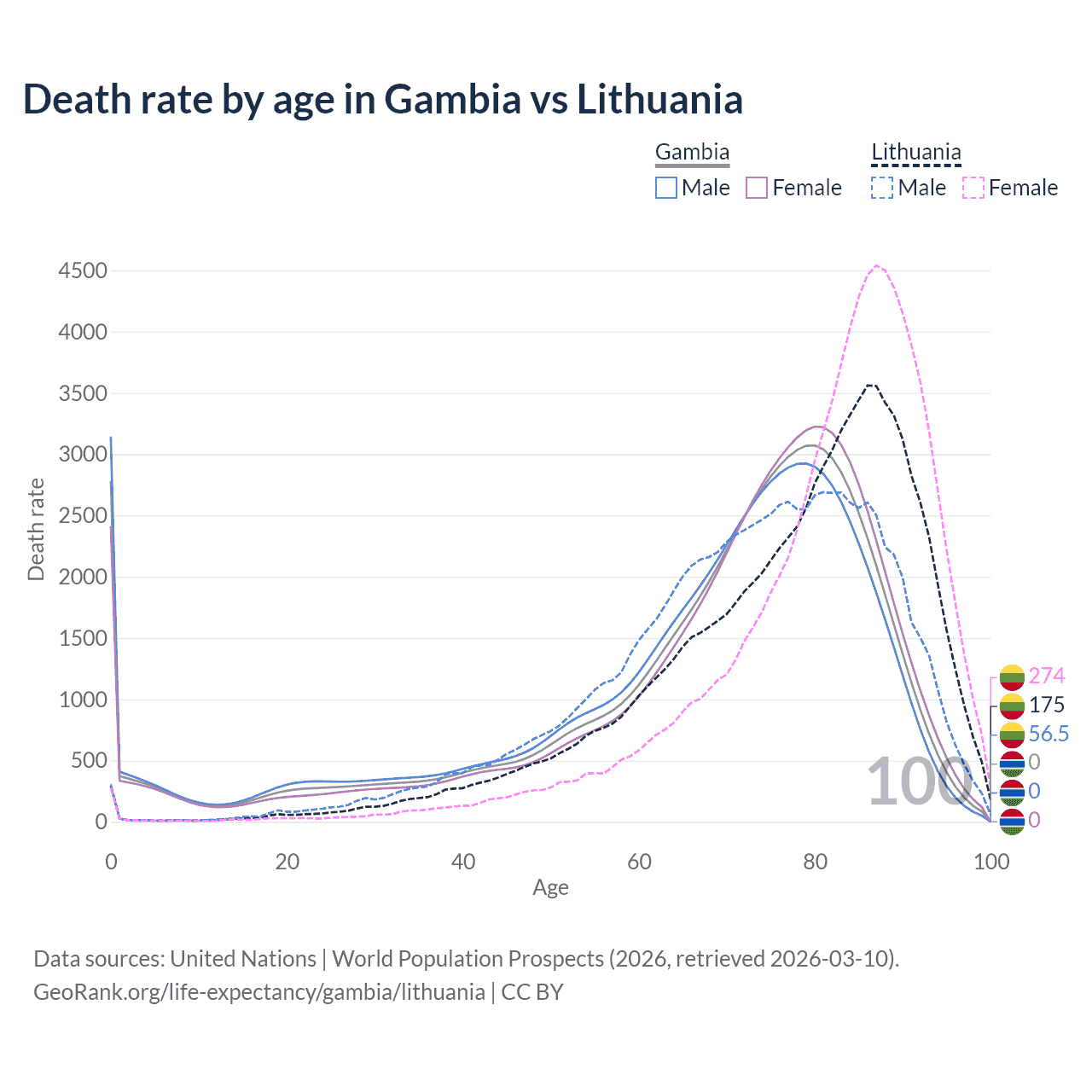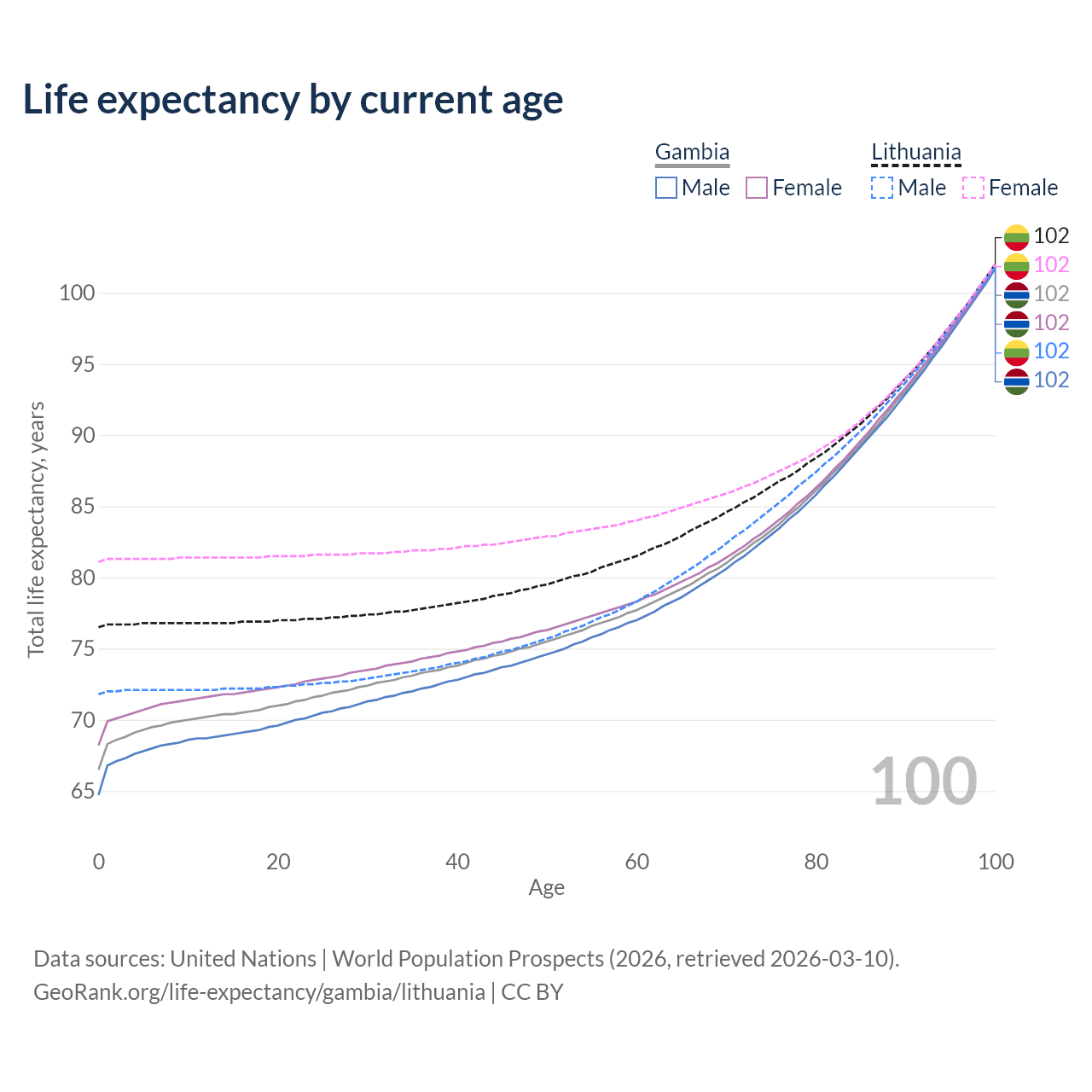 This life expectancy calculator shows the odds of living to 100, 95, 90, and below based on current age for both males and females in the Gambia and Lithuania, along with mean and median age of death. The calculations are based on the 2026 life tables (actuarial tables) from the UN World Population Prospects.