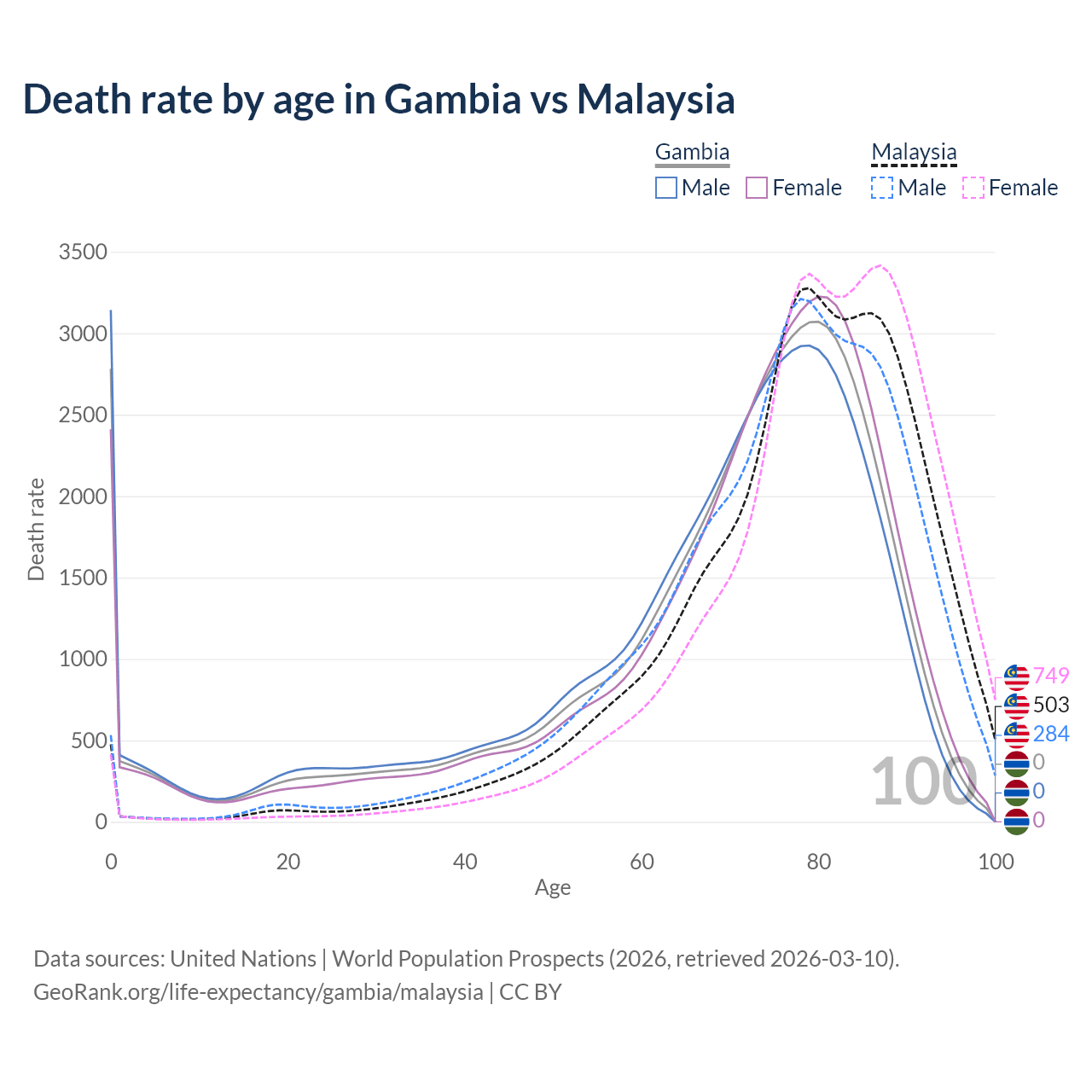 In the Gambia, the most common age of death is 80, compared to 79 in Malaysia. The median age of death is 73.4 in the Gambia and 79.8 in Malaysia, meaning only half of each cohort is expected to live past that age.
