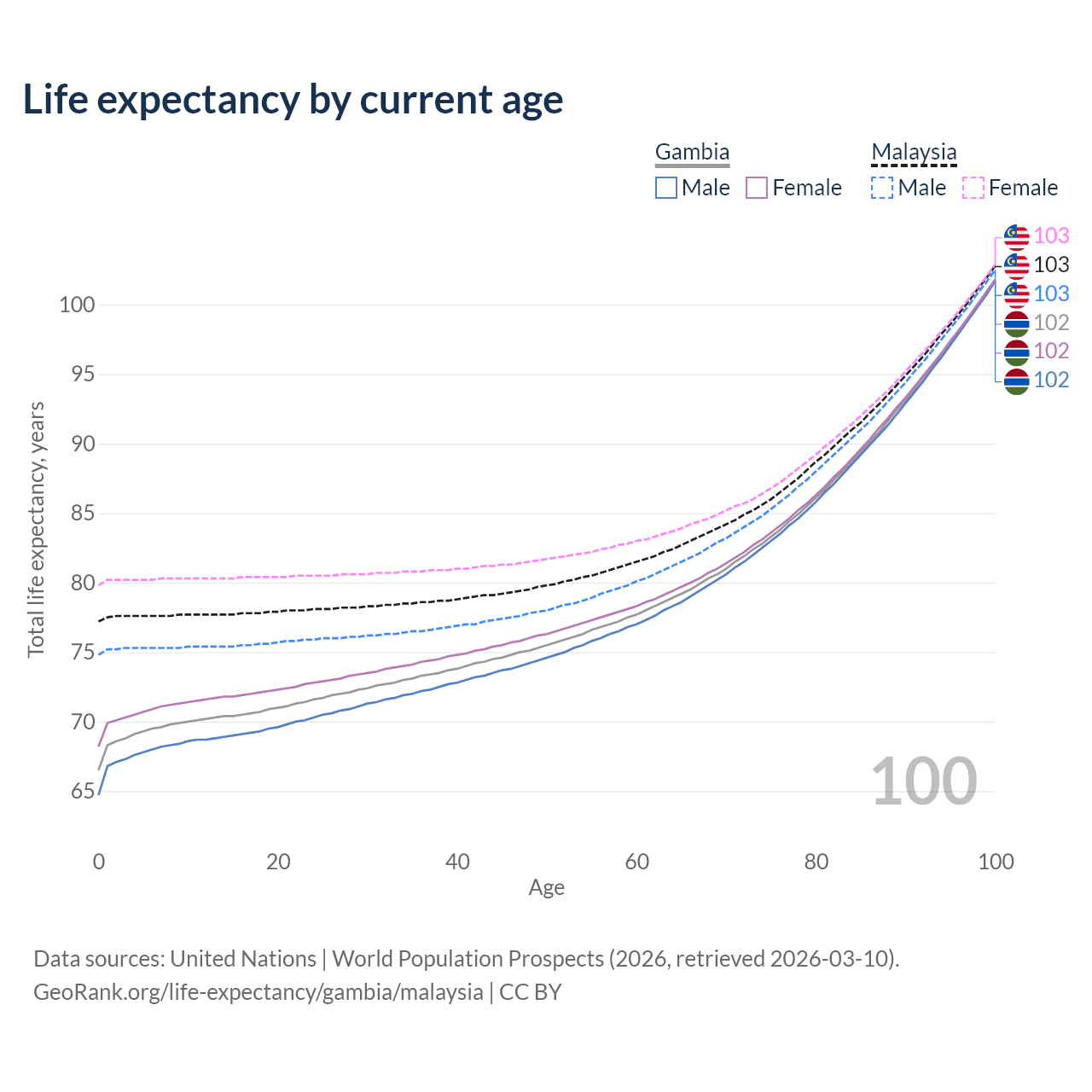This life expectancy calculator shows the odds of living to 100, 95, 90, and below based on current age for both males and females in the Gambia and Malaysia, along with mean and median age of death. The calculations are based on the 2026 life tables (actuarial tables) from the UN World Population Prospects.