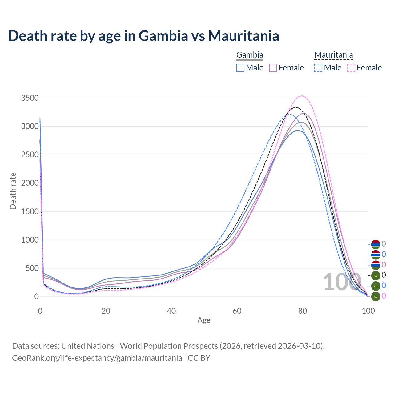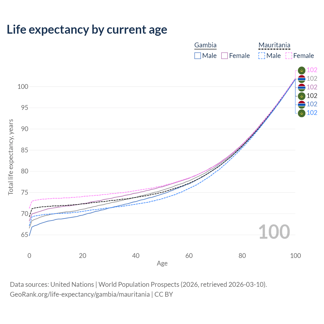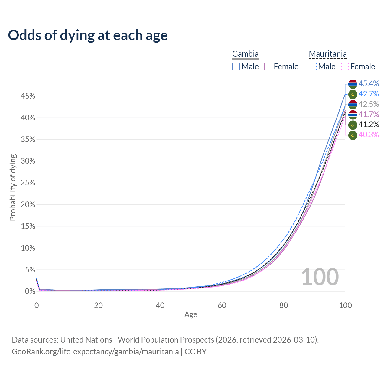 This life expectancy calculator shows the odds of living to 100, 95, 90, and below based on current age for both males and females in the Gambia and Mauritania, along with mean and median age of death. The calculations are based on the 2026 life tables (actuarial tables) from the UN World Population Prospects.
