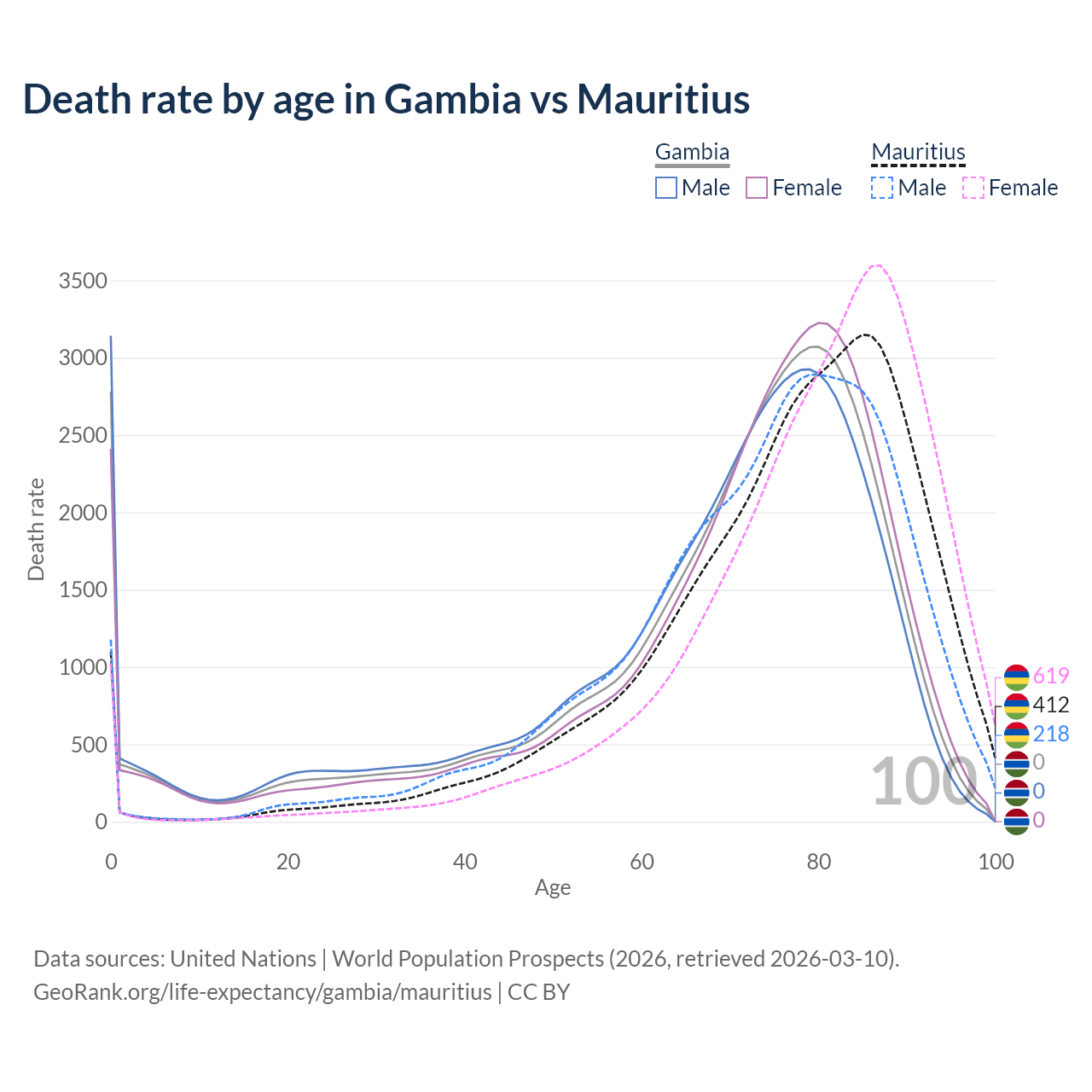 In the Gambia, the most common age of death is 80, compared to 85 in Mauritius. The median age of death is 73.4 in the Gambia and 79.1 in Mauritius, meaning only half of each cohort is expected to live past that age.