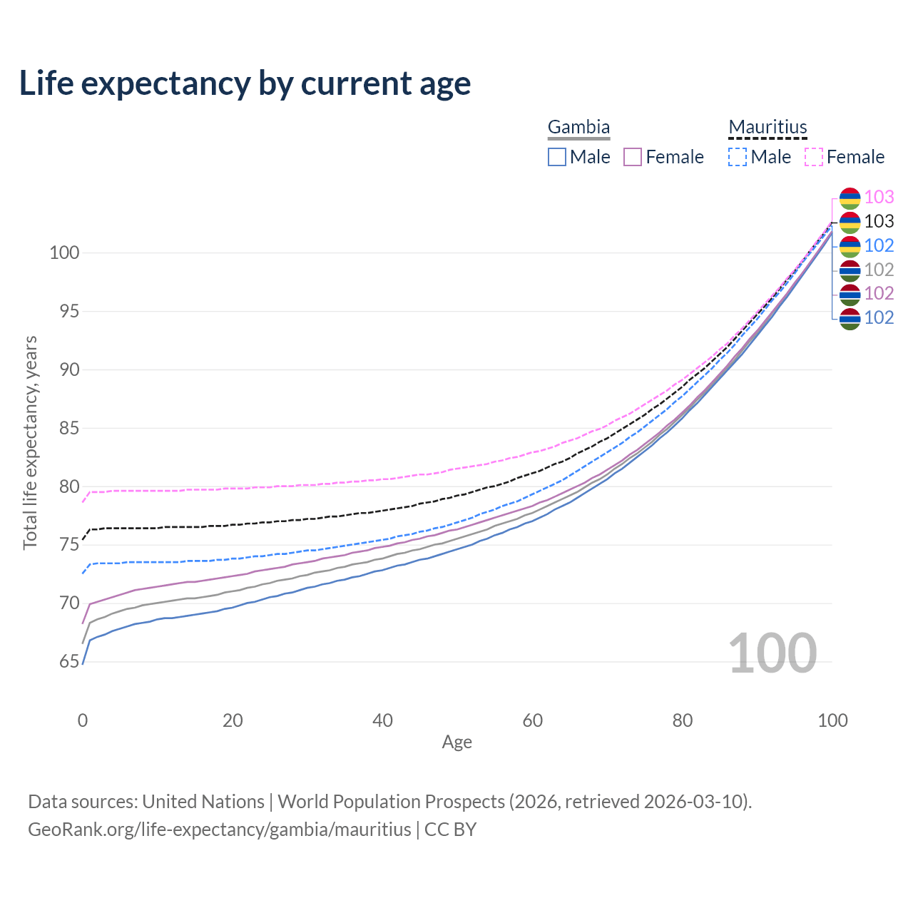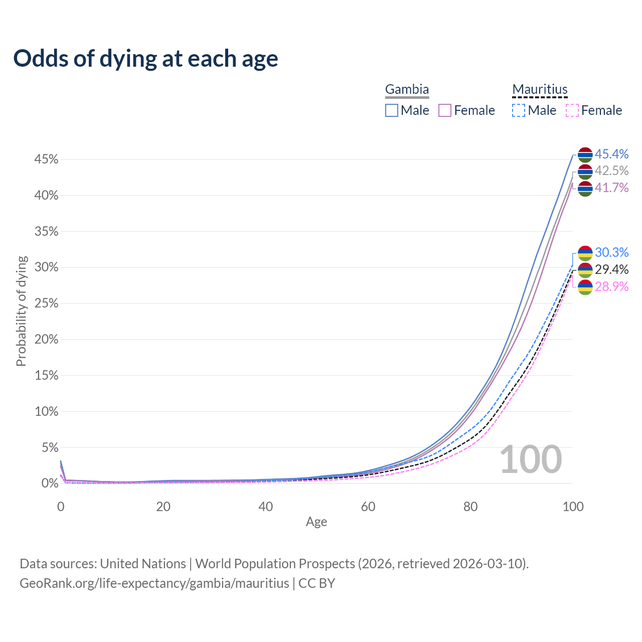 This life expectancy calculator shows the odds of living to 100, 95, 90, and below based on current age for both males and females in the Gambia and Mauritius, along with mean and median age of death. The calculations are based on the 2026 life tables (actuarial tables) from the UN World Population Prospects.
