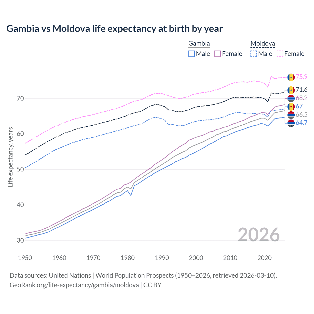 The average life expectancy at birth is 66.5 years in the Gambia vs 71.6 in Moldova. The Gambia is ranked 167/197 by life expectancy, and Moldova is 129/197. In the Gambia, the life expectancy is 64.7 years for males and 68.2 years for females. In Moldova, it's 67 years for males and 75.9 years for females.