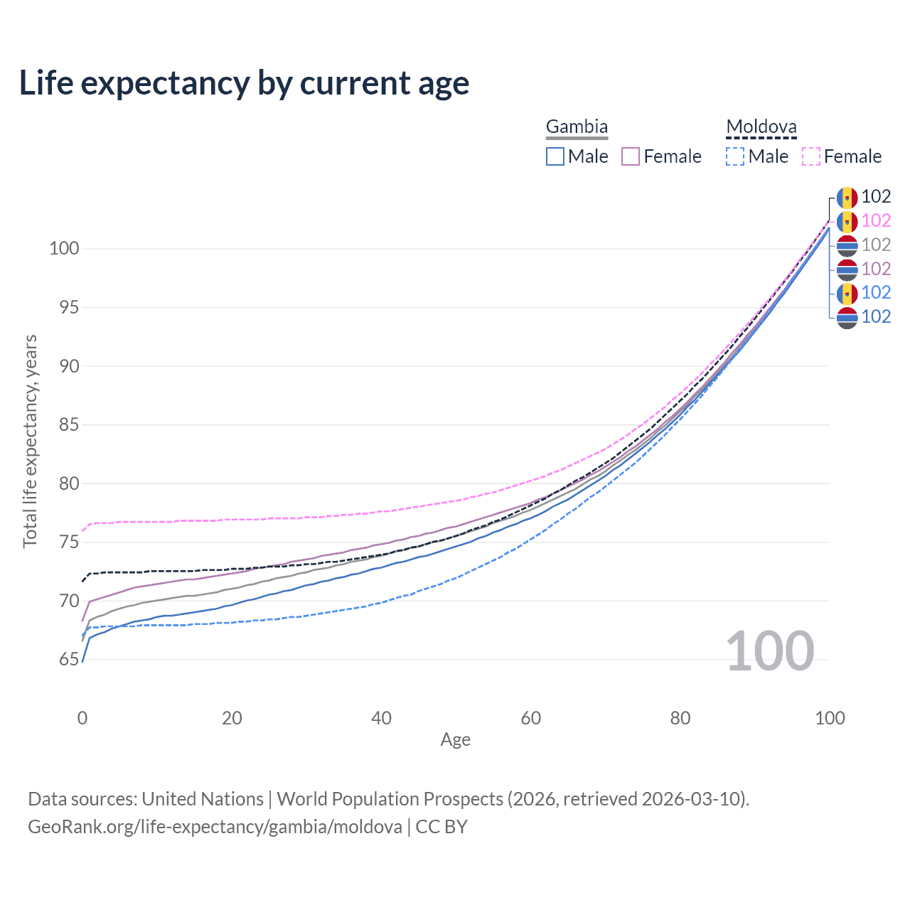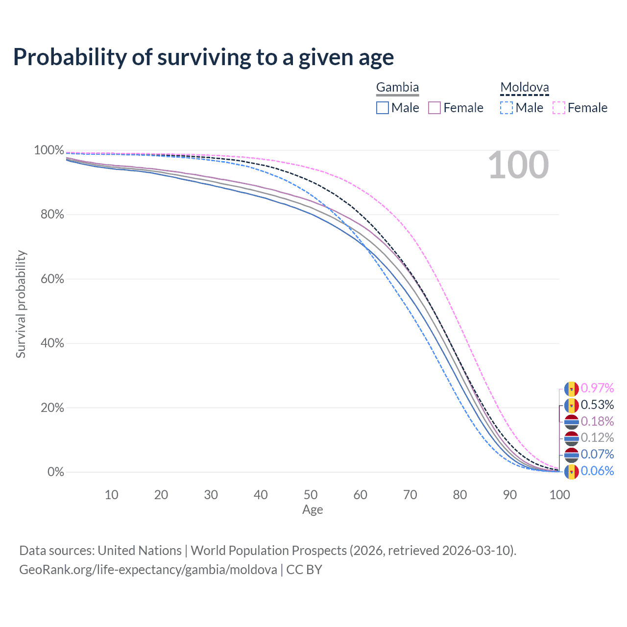 This life expectancy calculator shows the odds of living to 100, 95, 90, and below based on current age for both males and females in the Gambia and Moldova, along with mean and median age of death. The calculations are based on the 2026 life tables (actuarial tables) from the UN World Population Prospects.