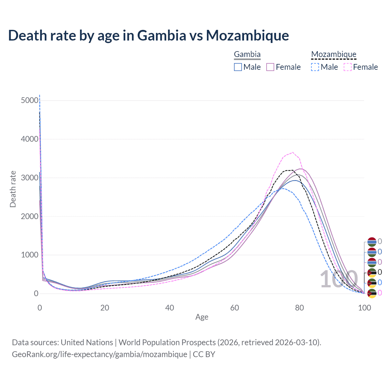 In the Gambia, the most common age of death is 80, compared to 0 in Mozambique. The median age of death is 73.4 in the Gambia and 71.2 in Mozambique, meaning only half of each cohort is expected to live past that age.