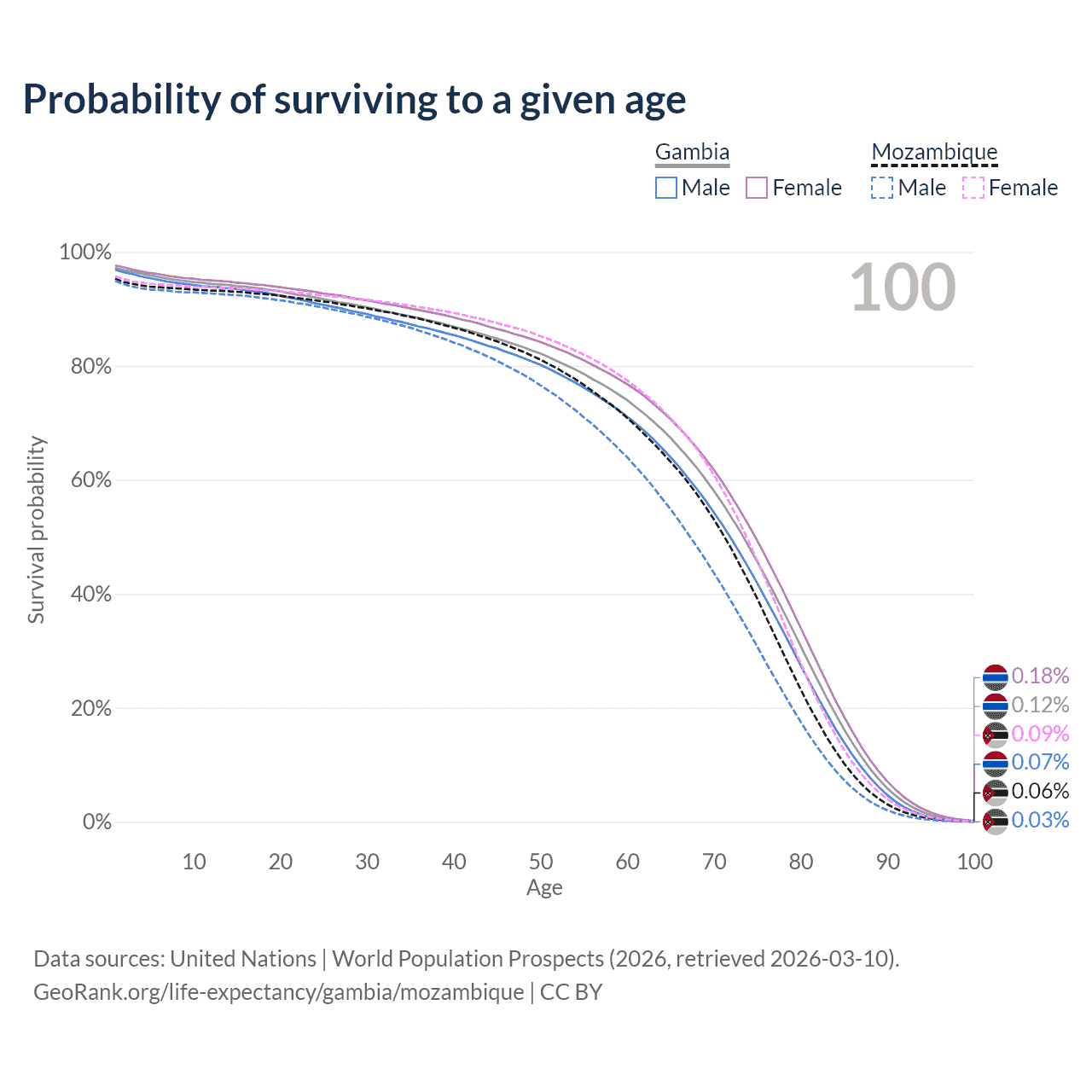 This life expectancy calculator shows the odds of living to 100, 95, 90, and below based on current age for both males and females in the Gambia and Mozambique, along with mean and median age of death. The calculations are based on the 2026 life tables (actuarial tables) from the UN World Population Prospects.