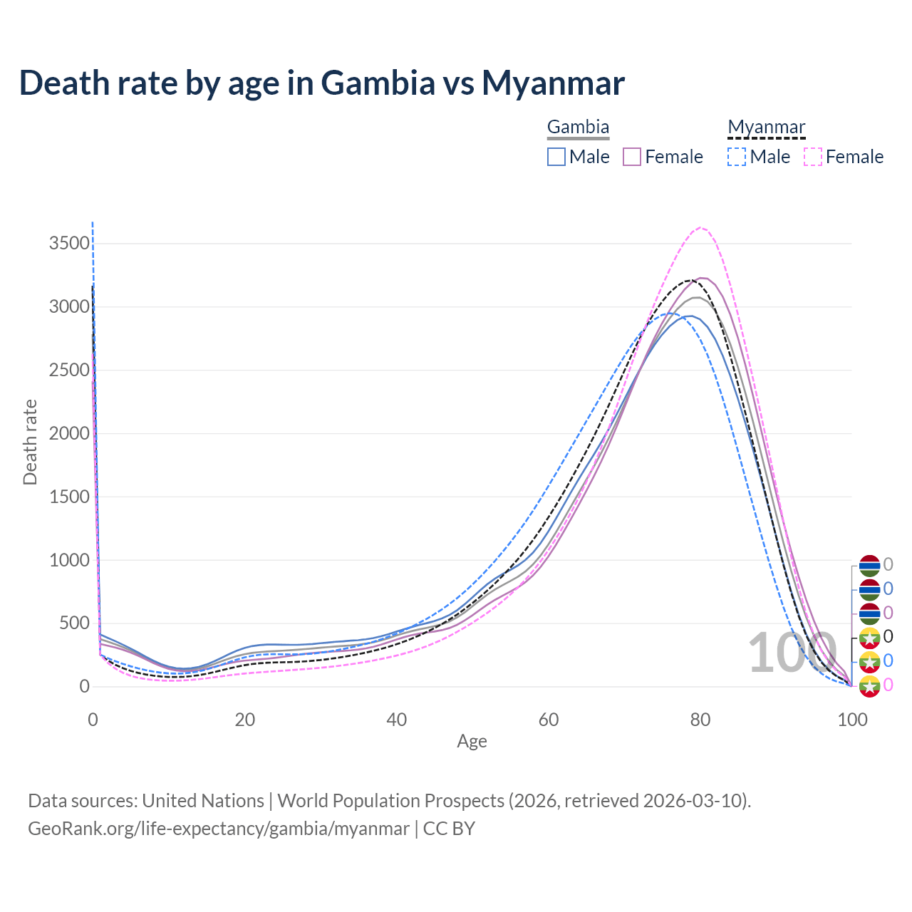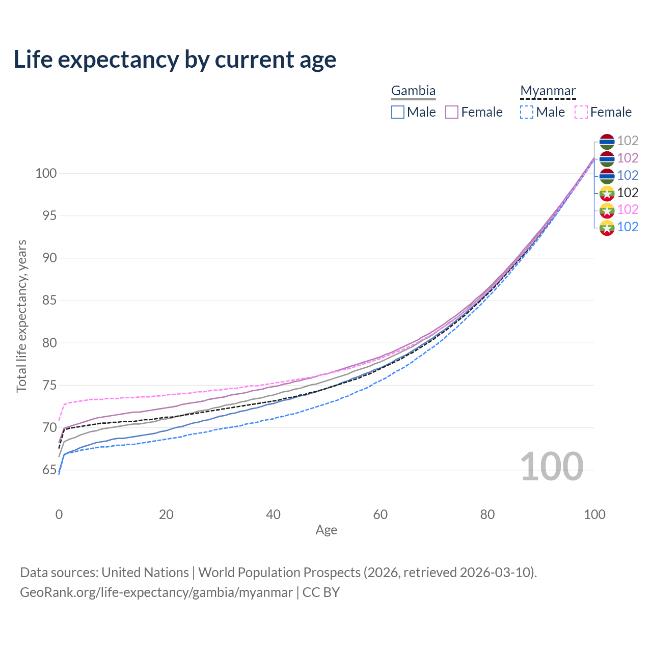This life expectancy calculator shows the odds of living to 100, 95, 90, and below based on current age for both males and females in the Gambia and Myanmar, along with mean and median age of death. The calculations are based on the 2026 life tables (actuarial tables) from the UN World Population Prospects.