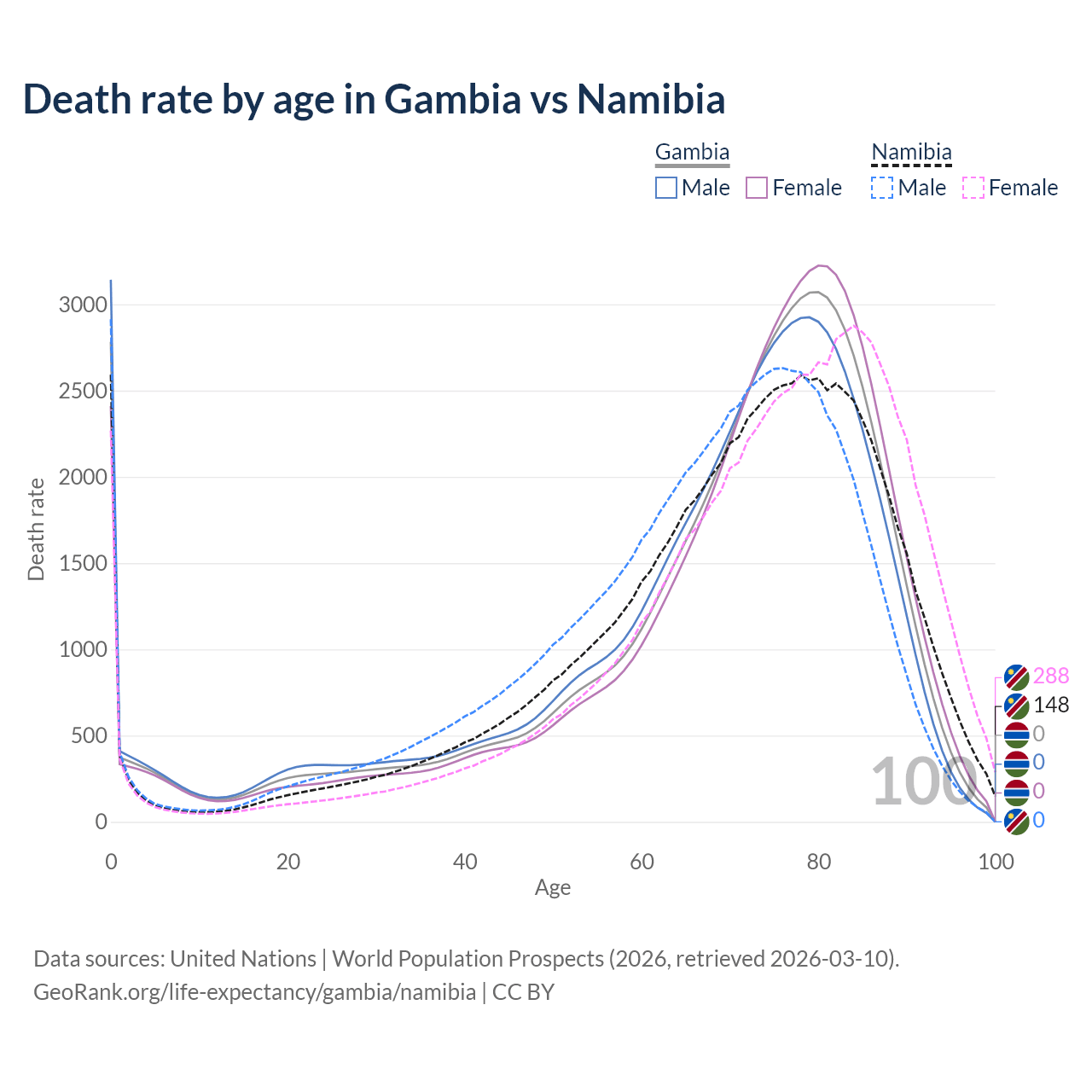 In the Gambia, the most common age of death is 80, compared to 0 in Namibia. The median age of death is 73.4 in the Gambia and 72.7 in Namibia, meaning only half of each cohort is expected to live past that age.