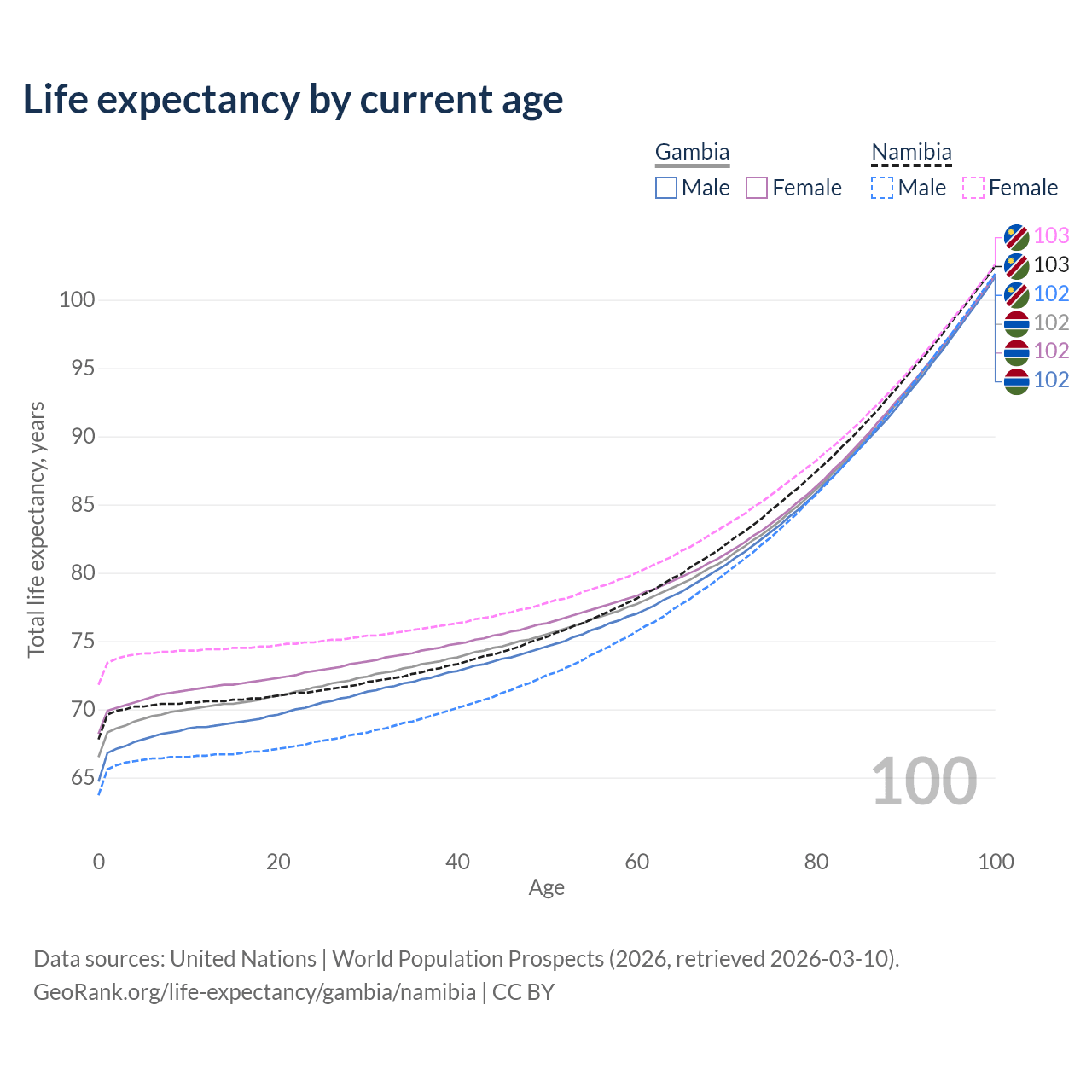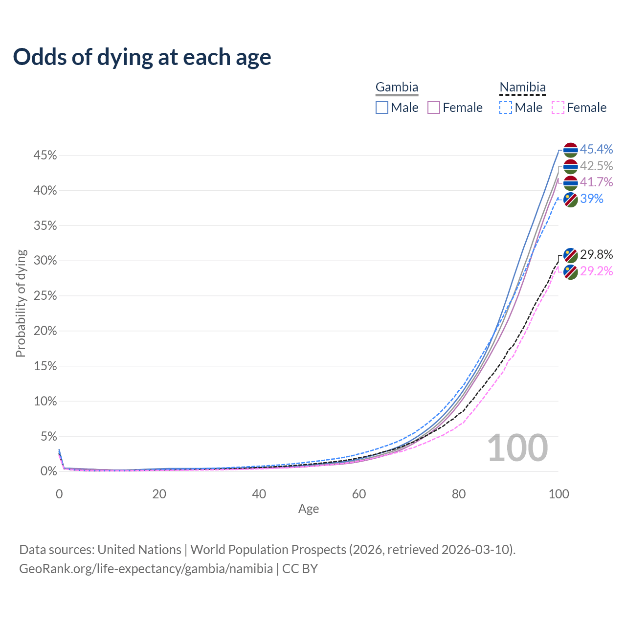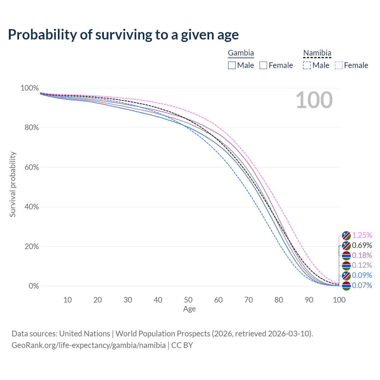 This life expectancy calculator shows the odds of living to 100, 95, 90, and below based on current age for both males and females in the Gambia and Namibia, along with mean and median age of death. The calculations are based on the 2026 life tables (actuarial tables) from the UN World Population Prospects.