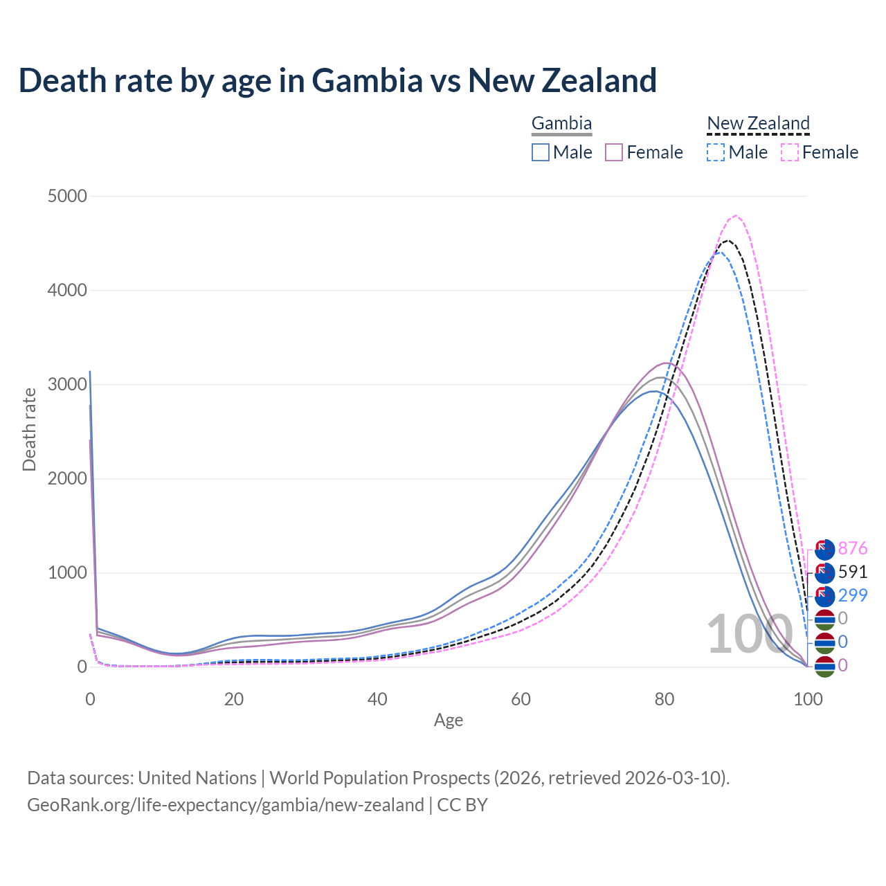 In the Gambia, the most common age of death is 80, compared to 89 in New Zealand. The median age of death is 73.4 in the Gambia and 85.8 in New Zealand, meaning only half of each cohort is expected to live past that age.