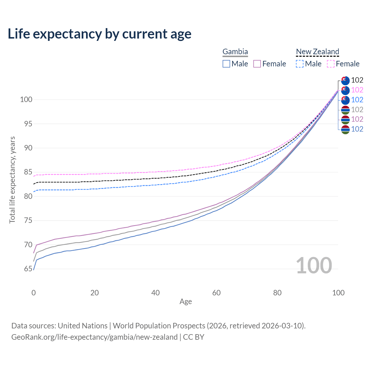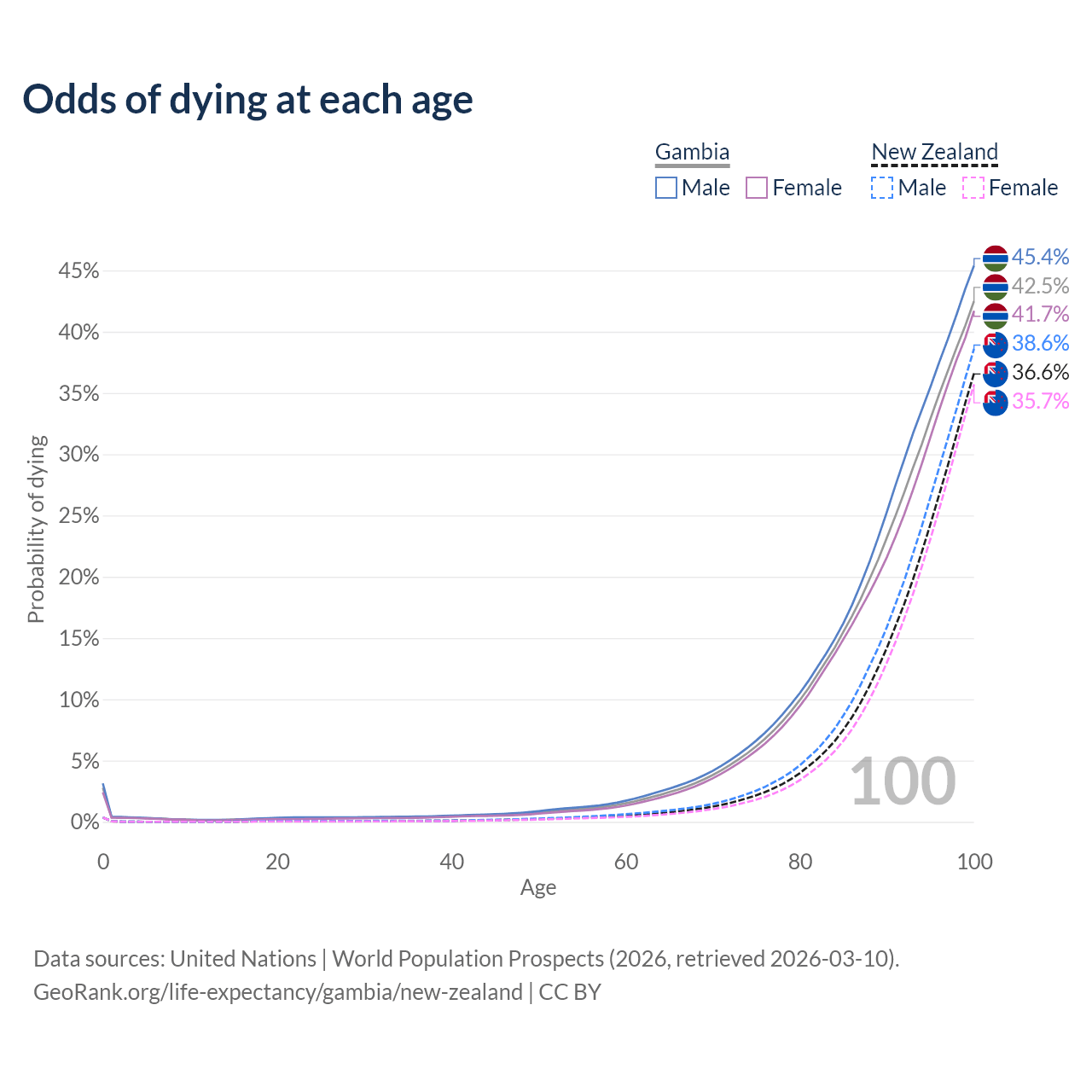 This life expectancy calculator shows the odds of living to 100, 95, 90, and below based on current age for both males and females in the Gambia and New Zealand, along with mean and median age of death. The calculations are based on the 2026 life tables (actuarial tables) from the UN World Population Prospects.