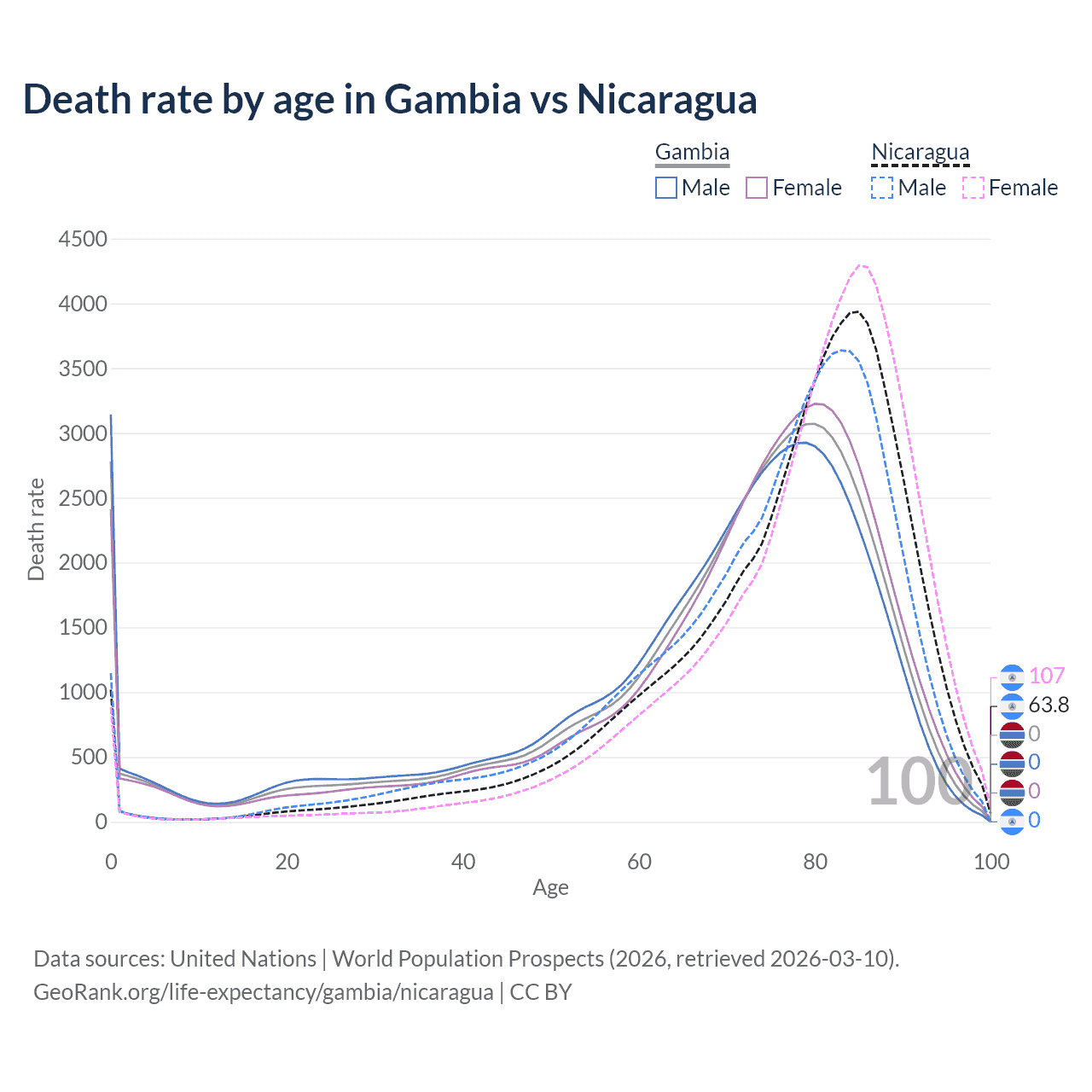 In the Gambia, the most common age of death is 80, compared to 85 in Nicaragua. The median age of death is 73.4 in the Gambia and 79.9 in Nicaragua, meaning only half of each cohort is expected to live past that age.