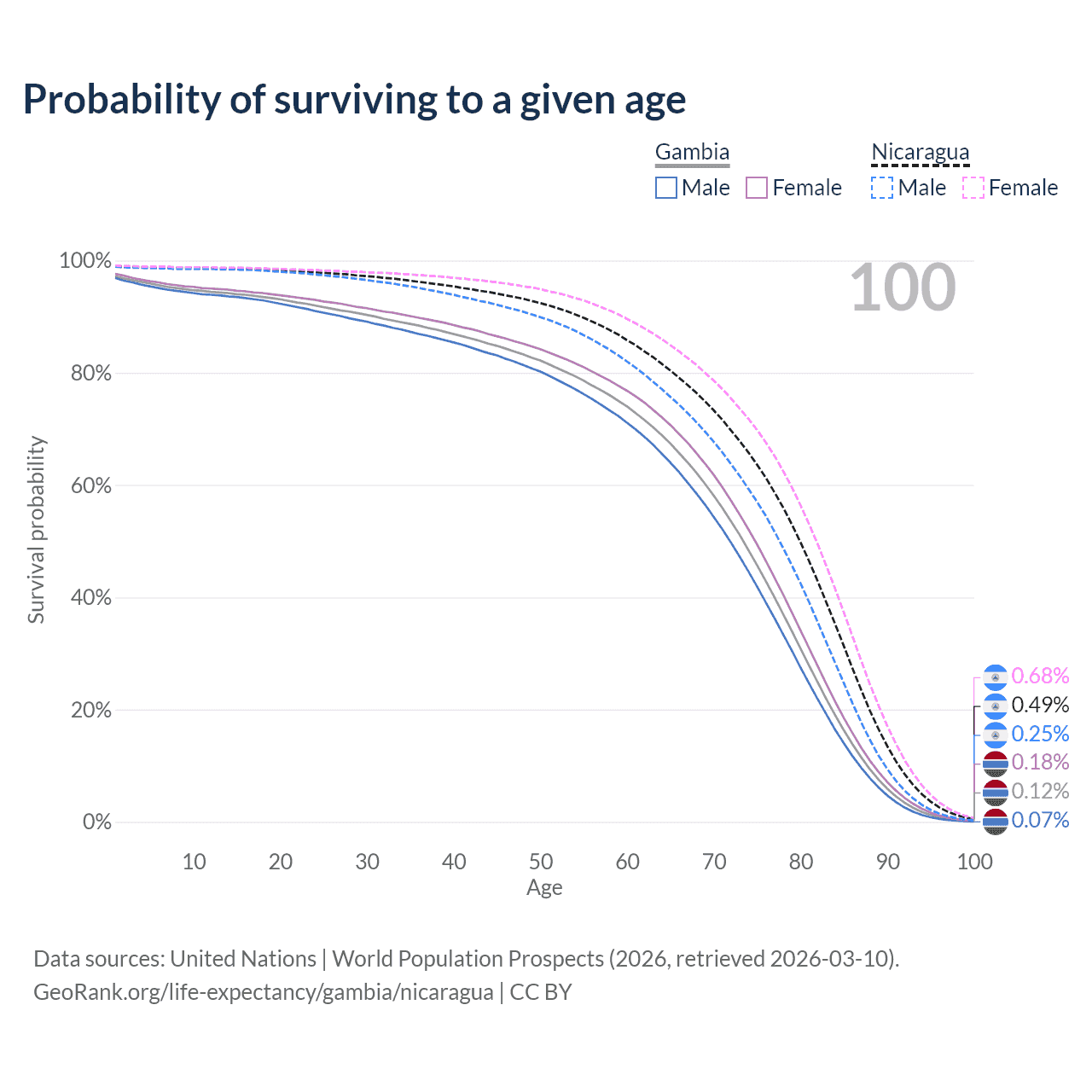This life expectancy calculator shows the odds of living to 100, 95, 90, and below based on current age for both males and females in the Gambia and Nicaragua, along with mean and median age of death. The calculations are based on the 2026 life tables (actuarial tables) from the UN World Population Prospects.