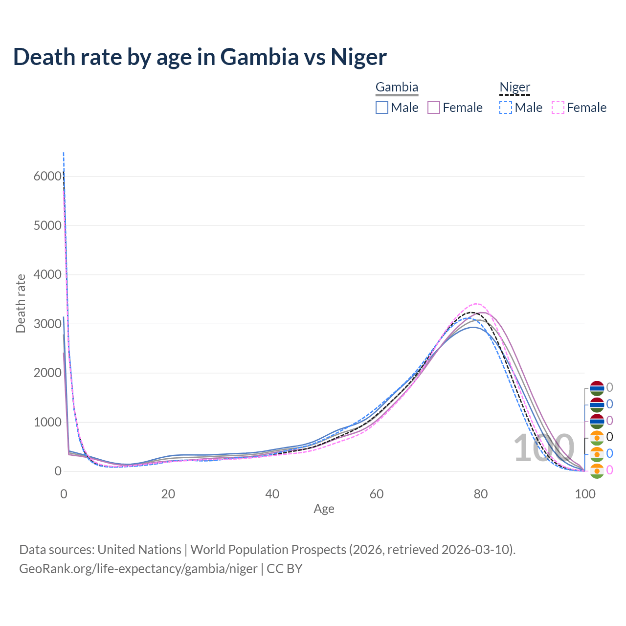 In the Gambia, the most common age of death is 80, compared to 0 in Niger. The median age of death is 73.4 in the Gambia and 71.7 in Niger, meaning only half of each cohort is expected to live past that age.