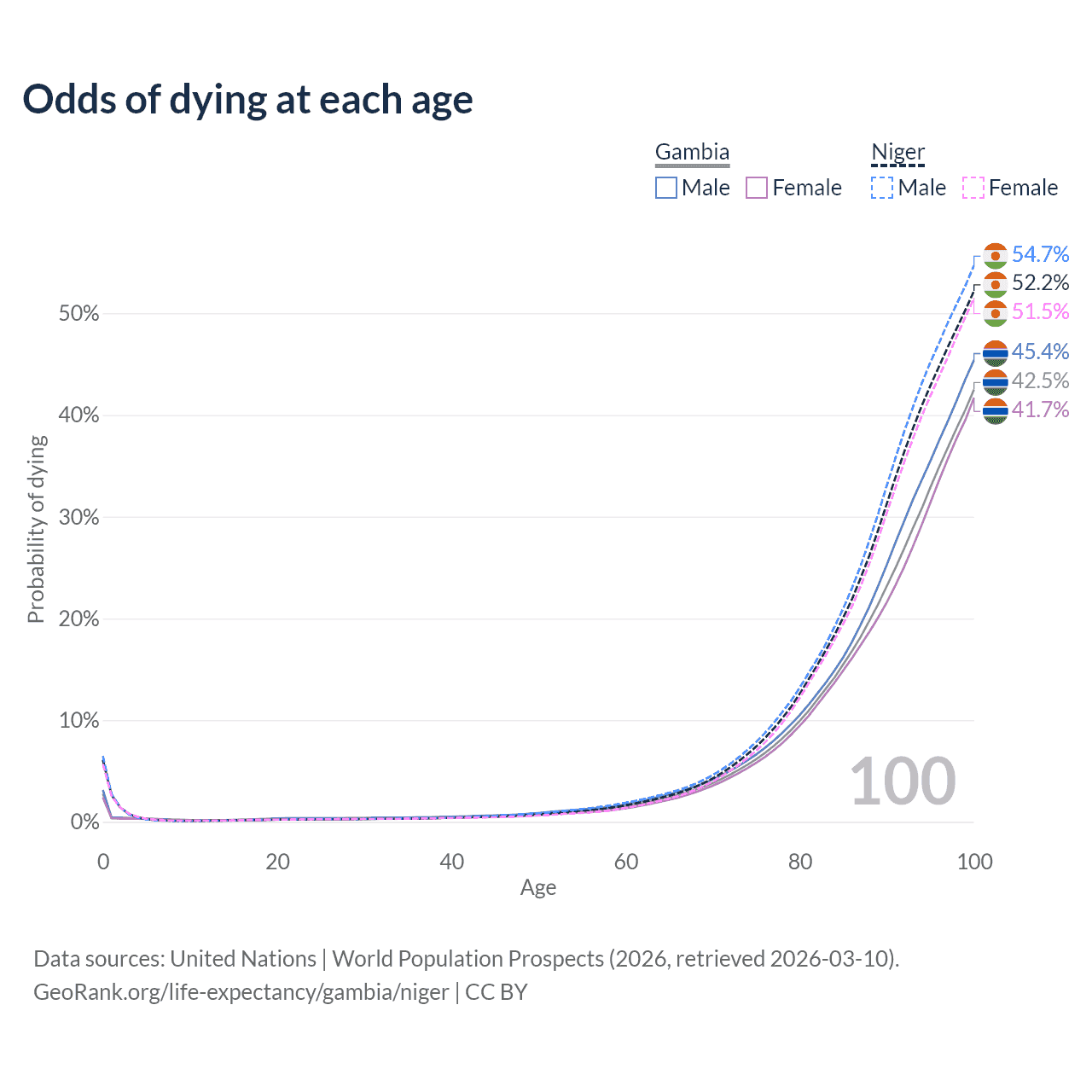 This life expectancy calculator shows the odds of living to 100, 95, 90, and below based on current age for both males and females in the Gambia and Niger, along with mean and median age of death. The calculations are based on the 2026 life tables (actuarial tables) from the UN World Population Prospects.