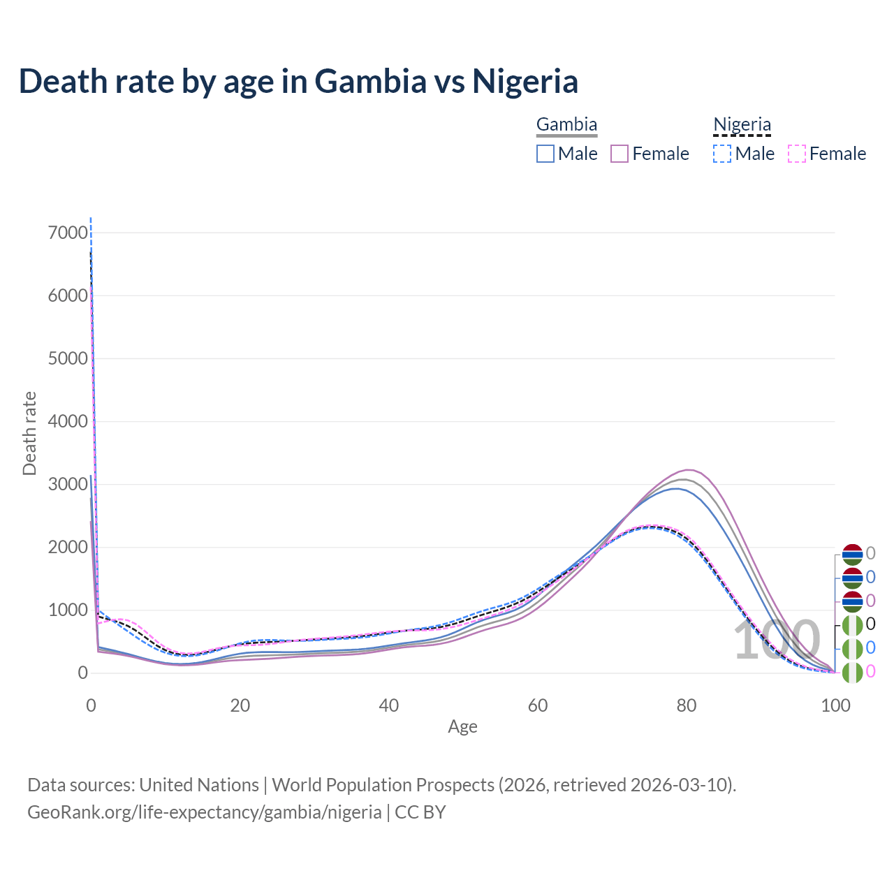 In the Gambia, the most common age of death is 80, compared to 0 in Nigeria. The median age of death is 73.4 in the Gambia and 64.3 in Nigeria, meaning only half of each cohort is expected to live past that age.