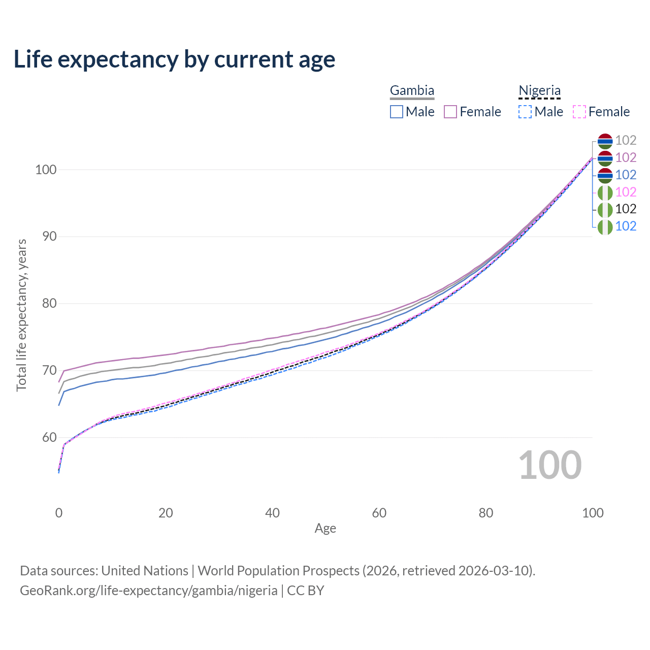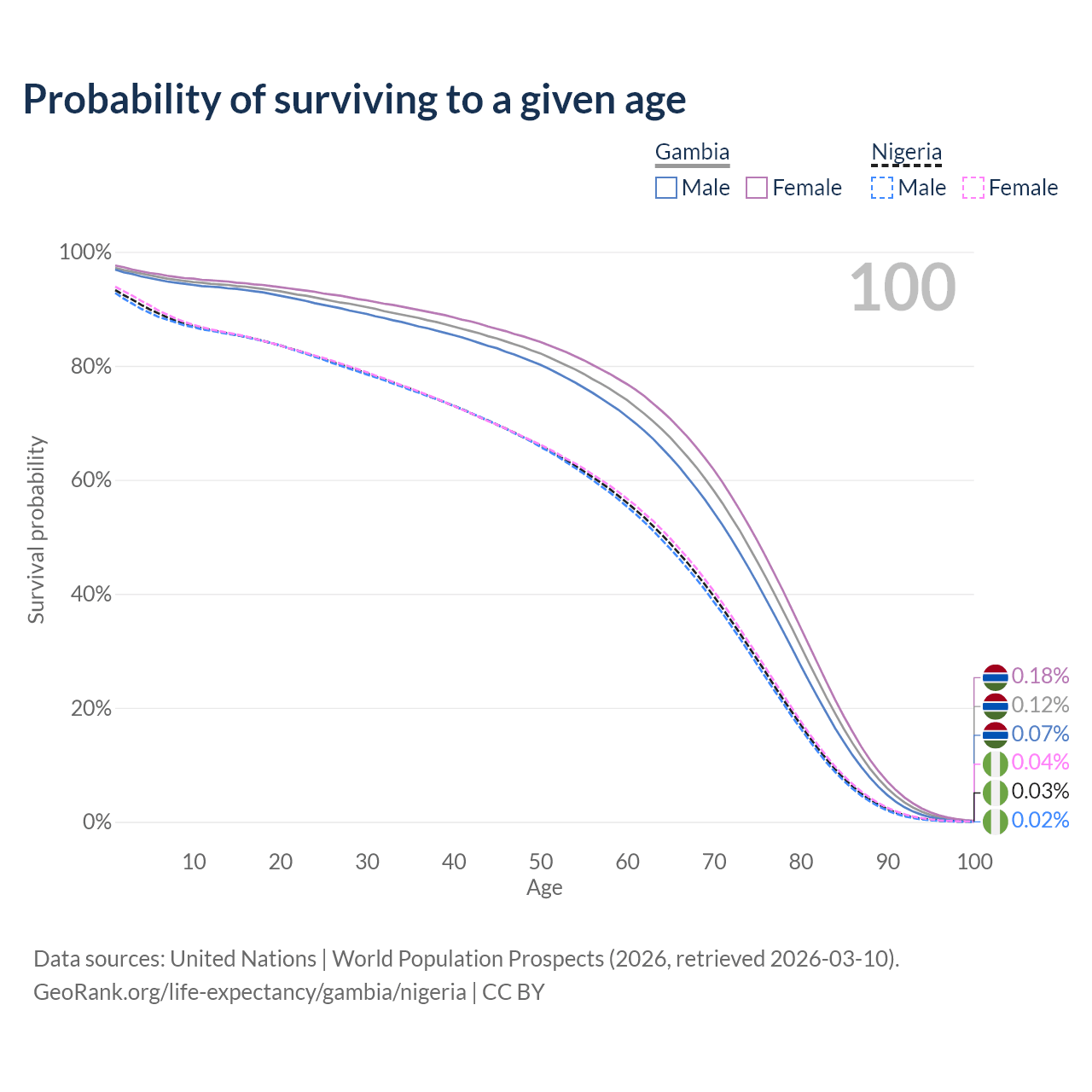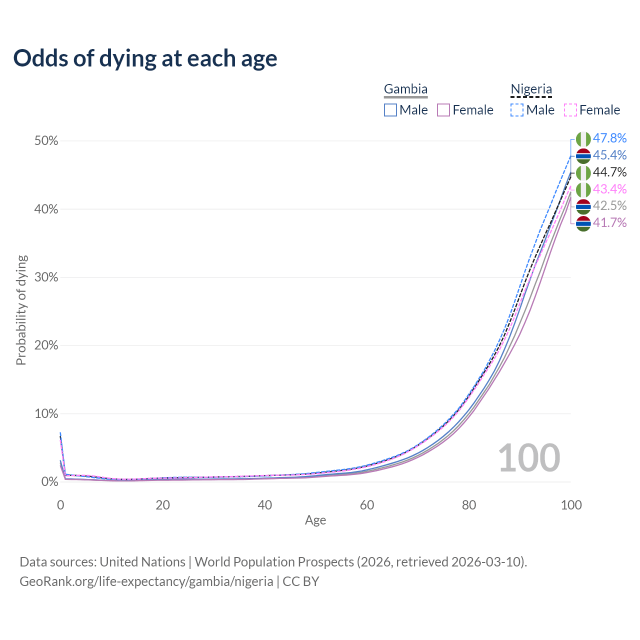 This life expectancy calculator shows the odds of living to 100, 95, 90, and below based on current age for both males and females in the Gambia and Nigeria, along with mean and median age of death. The calculations are based on the 2026 life tables (actuarial tables) from the UN World Population Prospects.