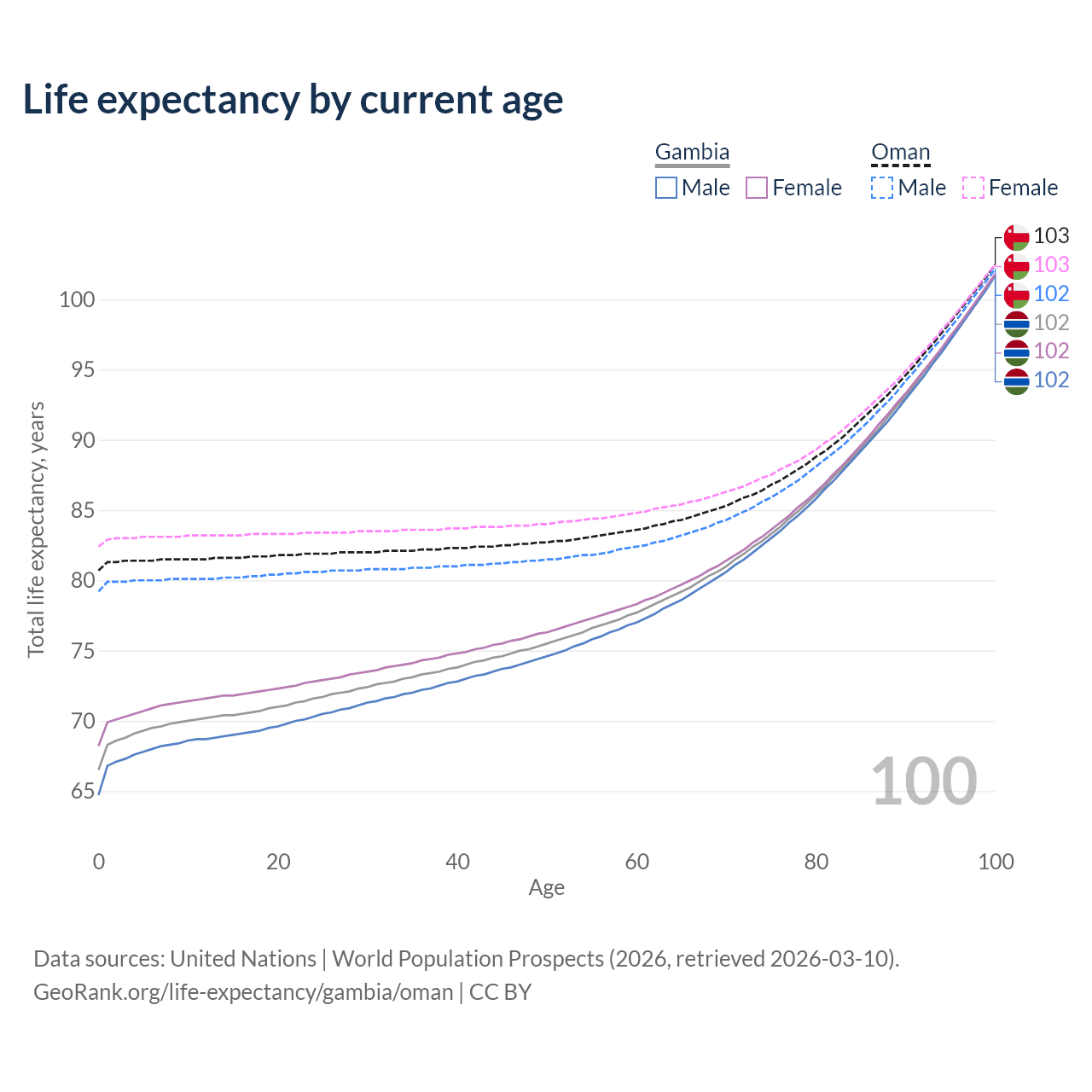 This life expectancy calculator shows the odds of living to 100, 95, 90, and below based on current age for both males and females in the Gambia and Oman, along with mean and median age of death. The calculations are based on the 2026 life tables (actuarial tables) from the UN World Population Prospects.