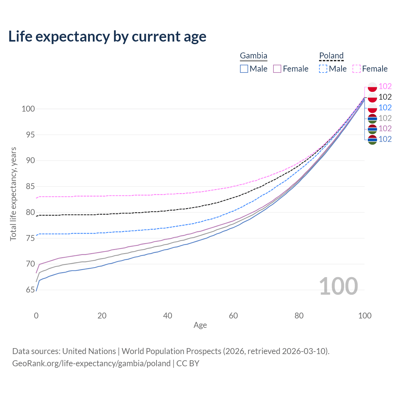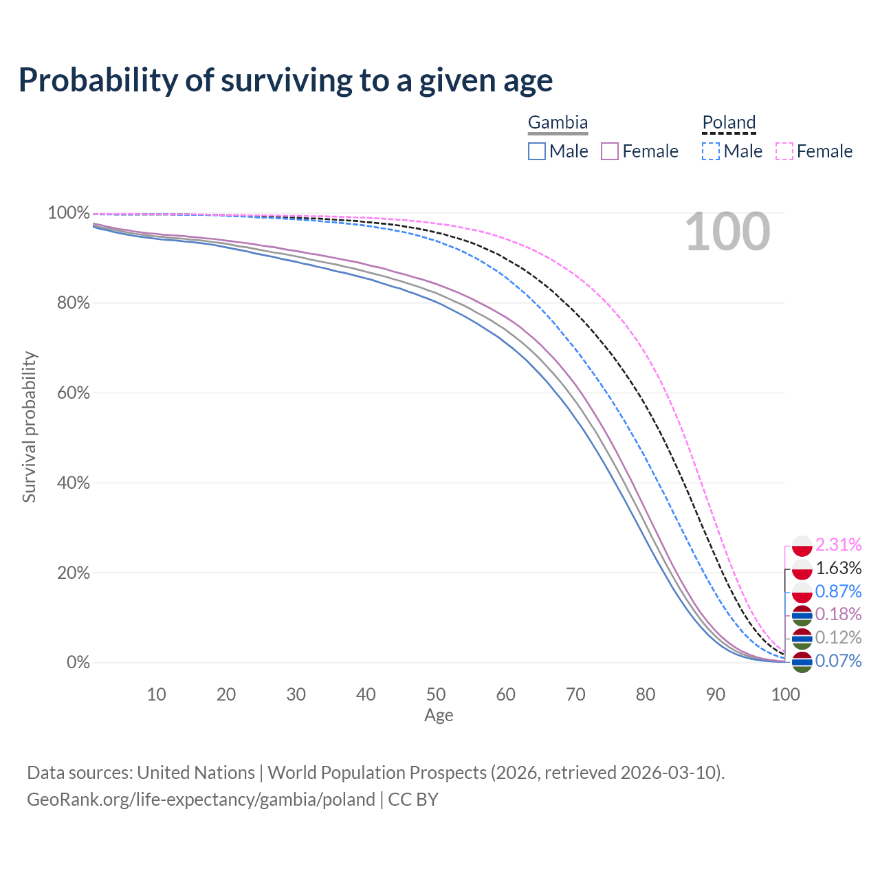 This life expectancy calculator shows the odds of living to 100, 95, 90, and below based on current age for both males and females in the Gambia and Poland, along with mean and median age of death. The calculations are based on the 2026 life tables (actuarial tables) from the UN World Population Prospects.