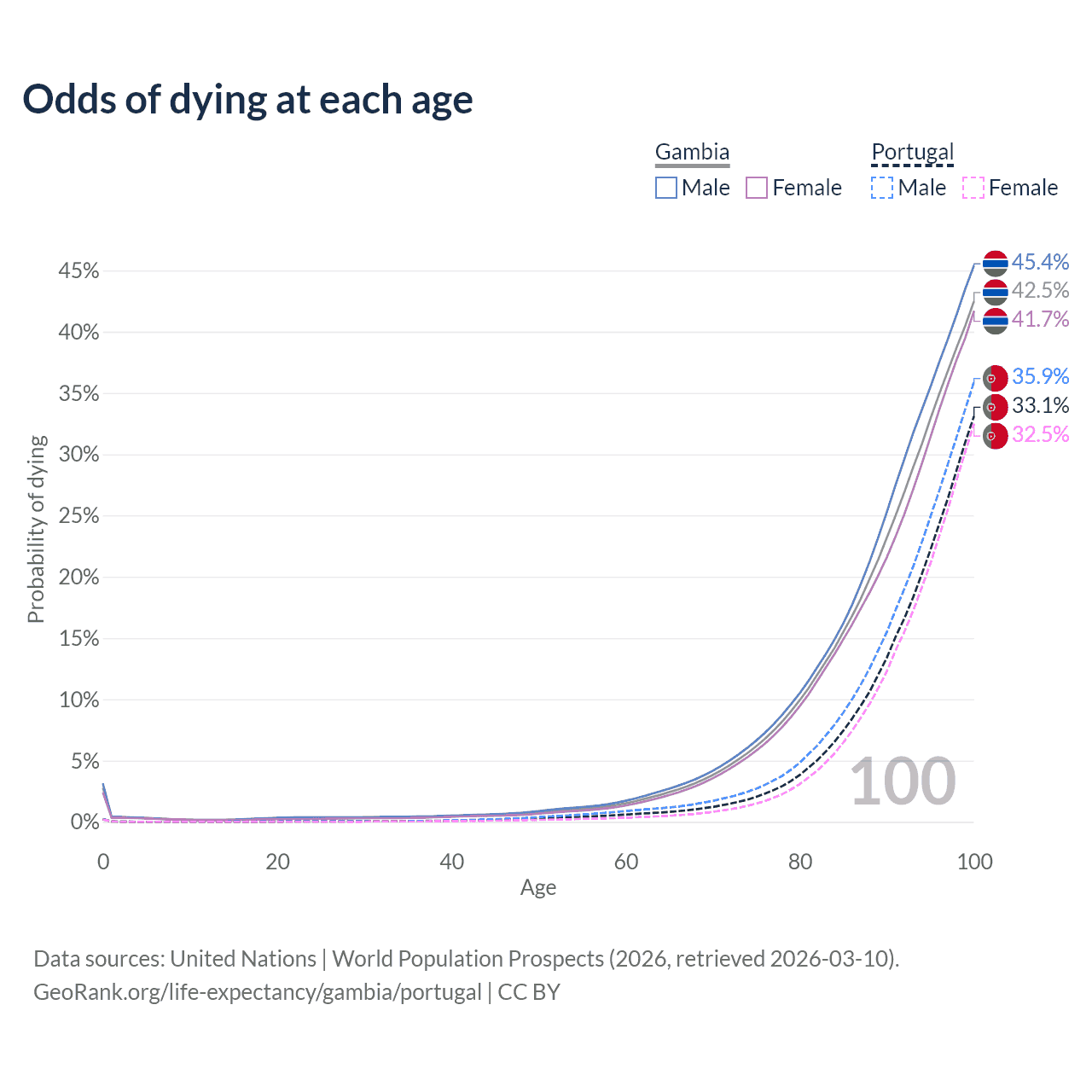 This life expectancy calculator shows the odds of living to 100, 95, 90, and below based on current age for both males and females in the Gambia and Portugal, along with mean and median age of death. The calculations are based on the 2026 life tables (actuarial tables) from the UN World Population Prospects.