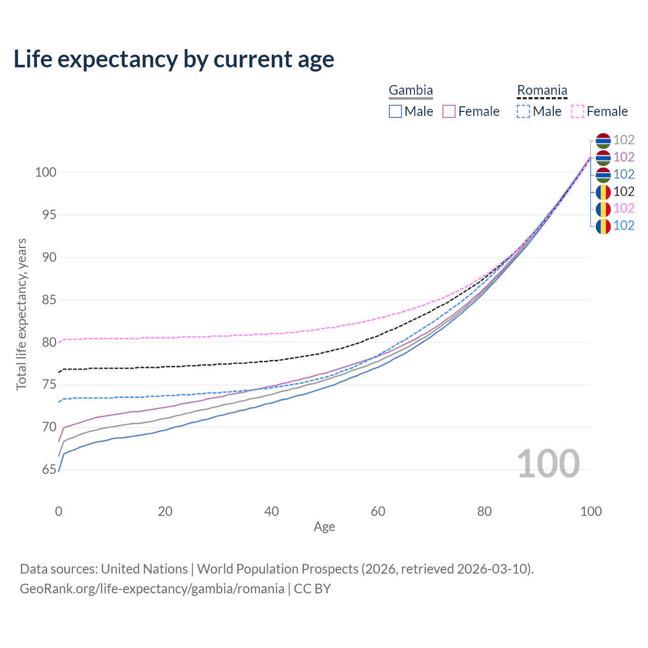 This life expectancy calculator shows the odds of living to 100, 95, 90, and below based on current age for both males and females in the Gambia and Romania, along with mean and median age of death. The calculations are based on the 2026 life tables (actuarial tables) from the UN World Population Prospects.
