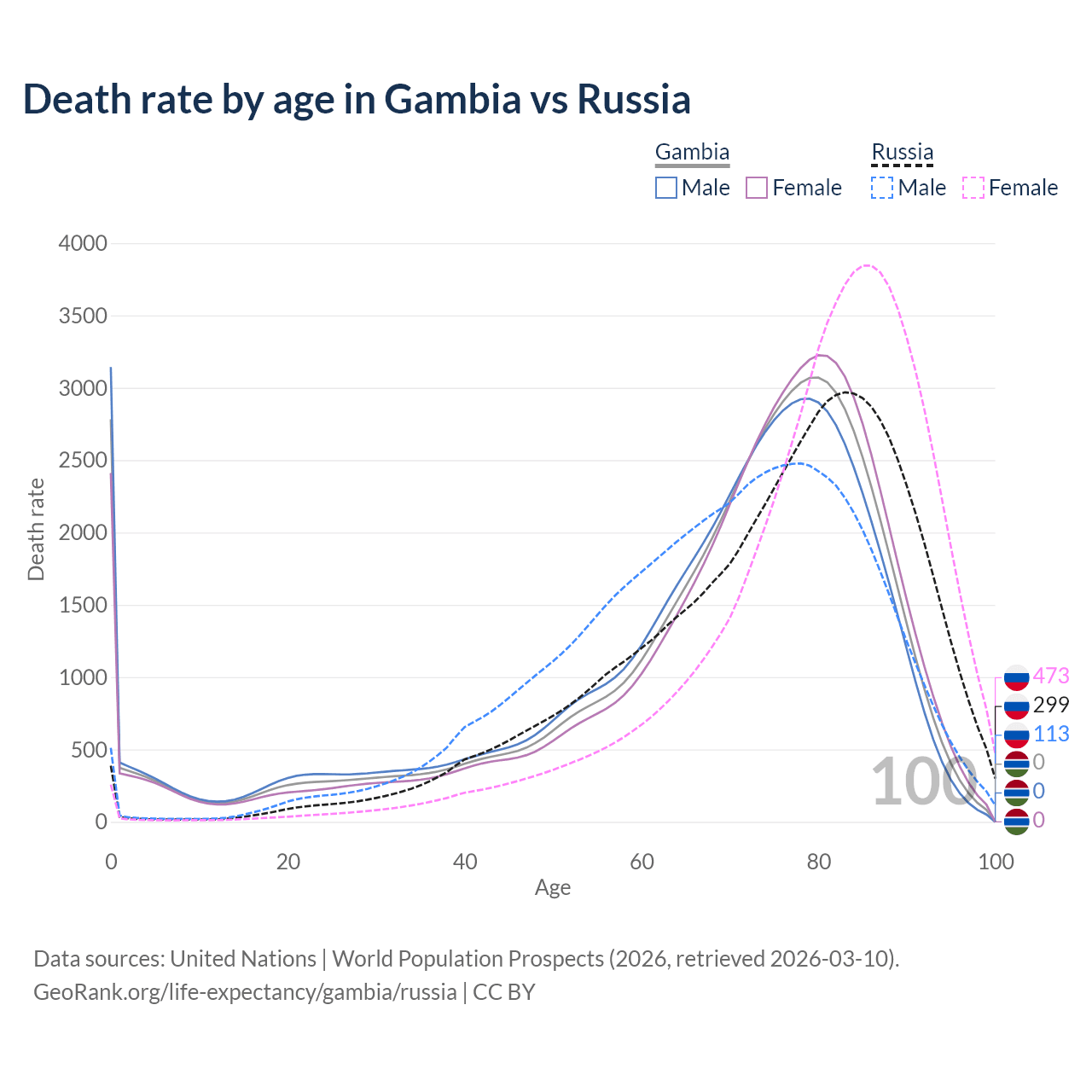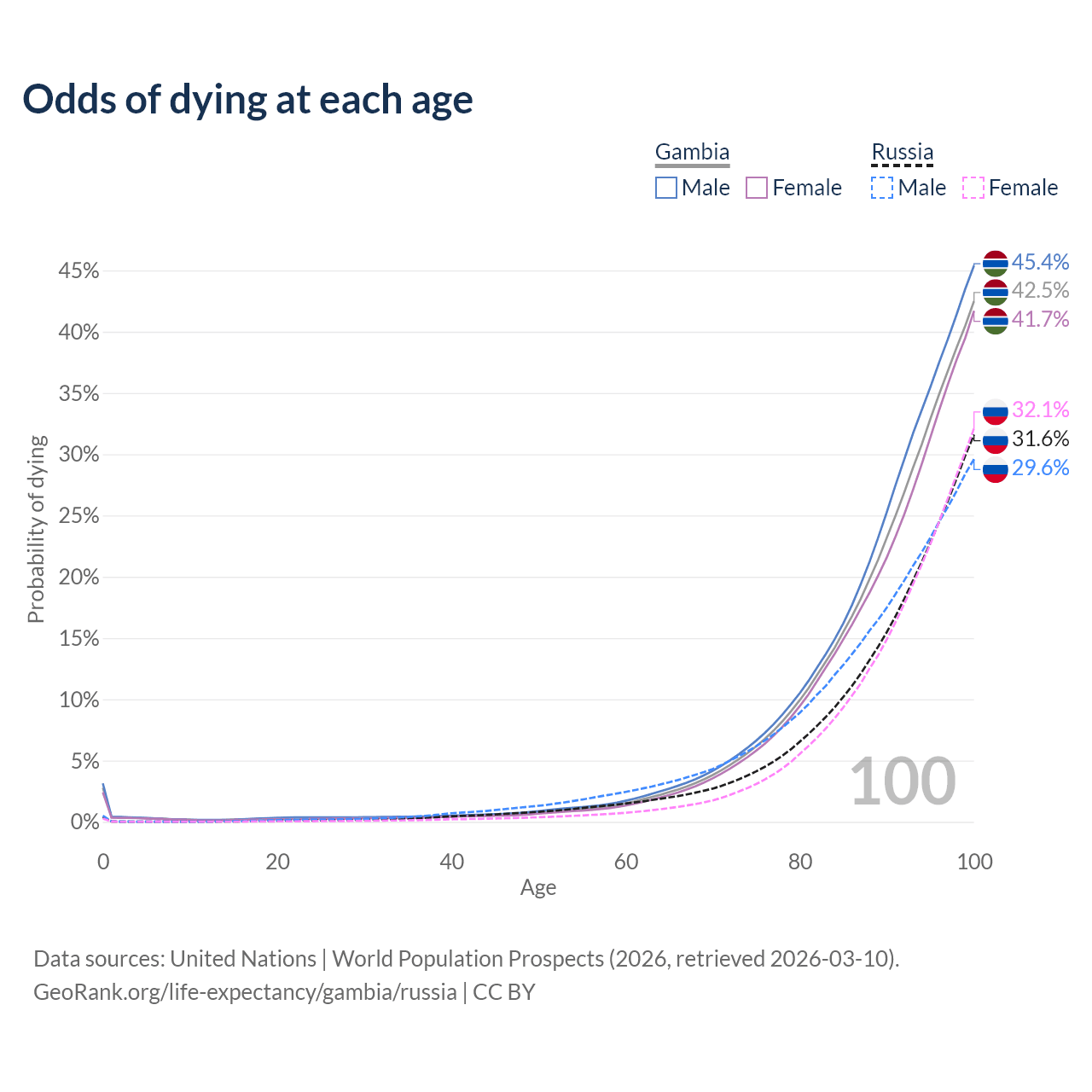 This life expectancy calculator shows the odds of living to 100, 95, 90, and below based on current age for both males and females in the Gambia and Russia, along with mean and median age of death. The calculations are based on the 2026 life tables (actuarial tables) from the UN World Population Prospects.
