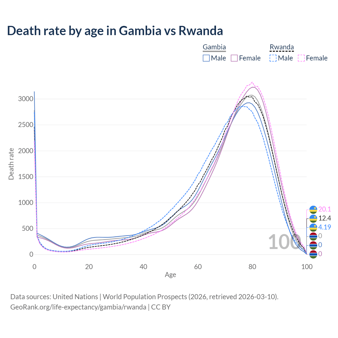 In the Gambia, the most common age of death is 80, compared to 78 in Rwanda. The median age of death is 73.4 in the Gambia and 73.5 in Rwanda, meaning only half of each cohort is expected to live past that age.
