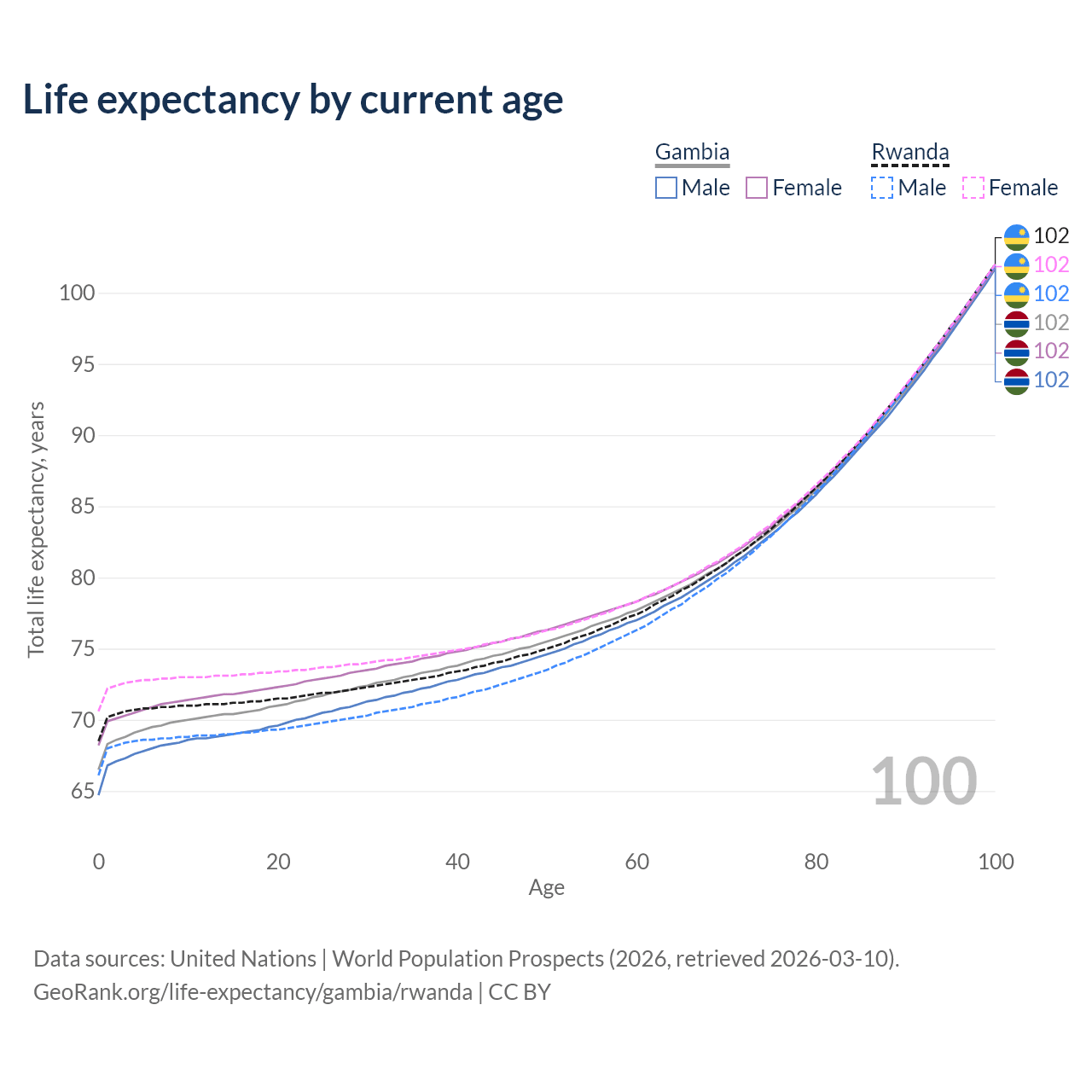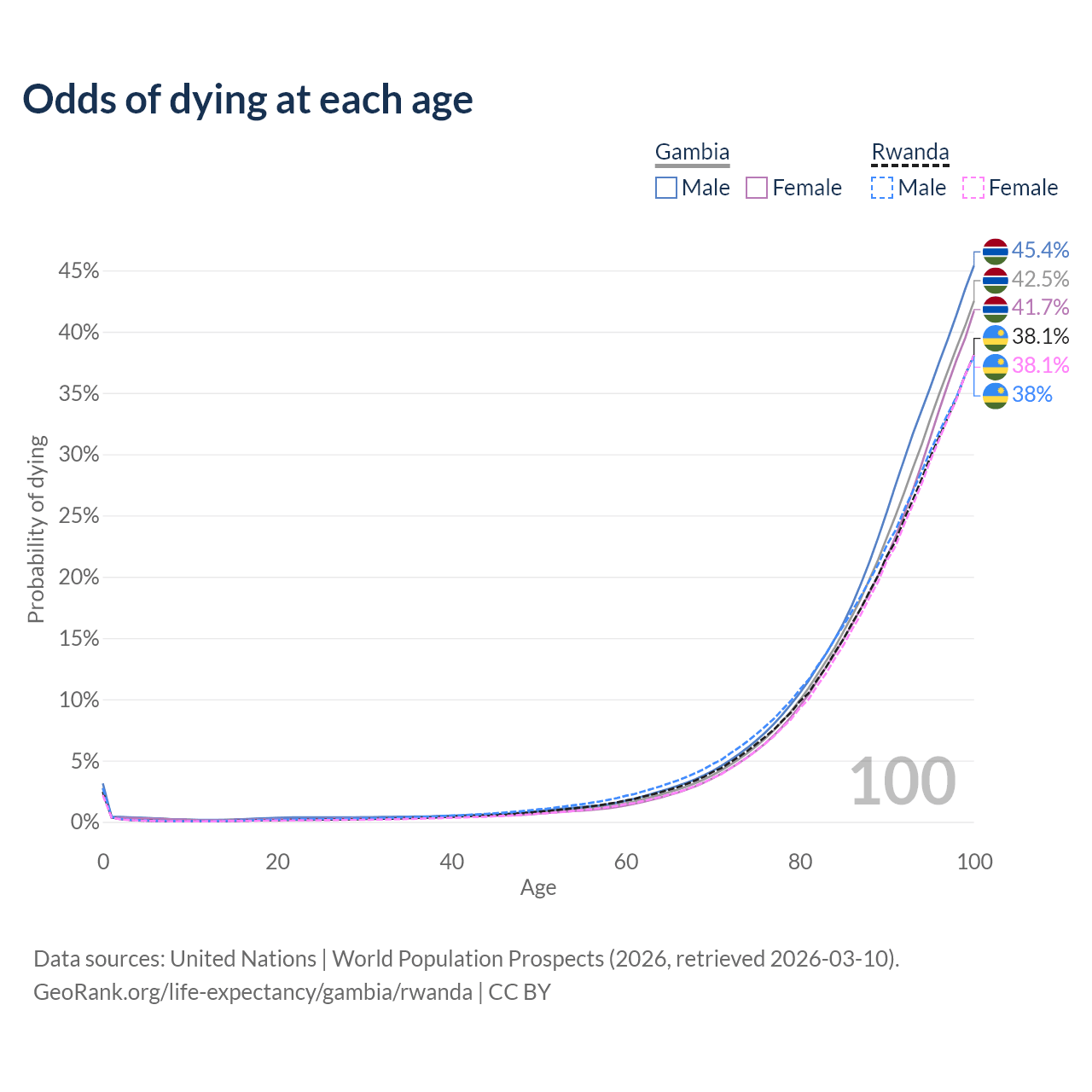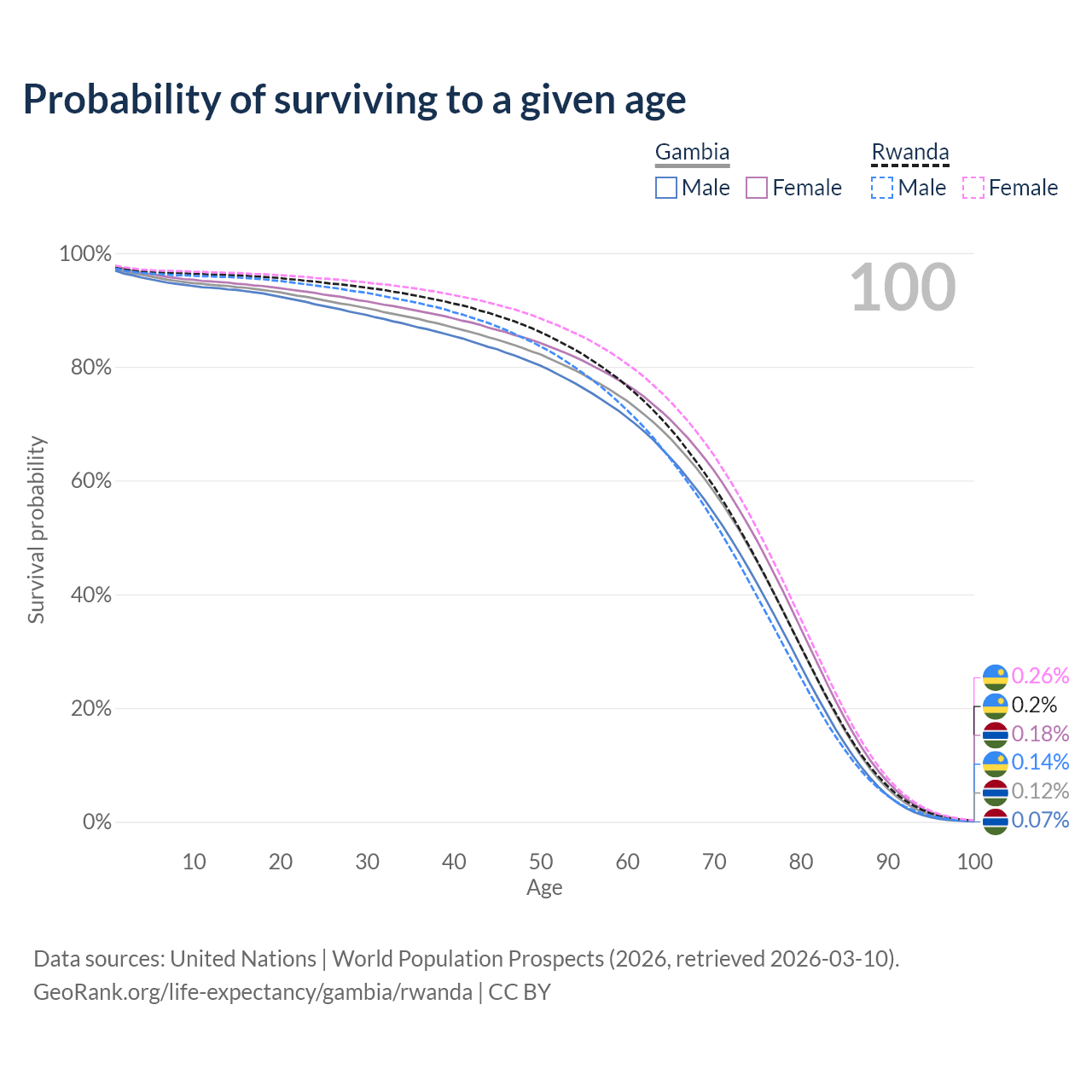 This life expectancy calculator shows the odds of living to 100, 95, 90, and below based on current age for both males and females in the Gambia and Rwanda, along with mean and median age of death. The calculations are based on the 2026 life tables (actuarial tables) from the UN World Population Prospects.