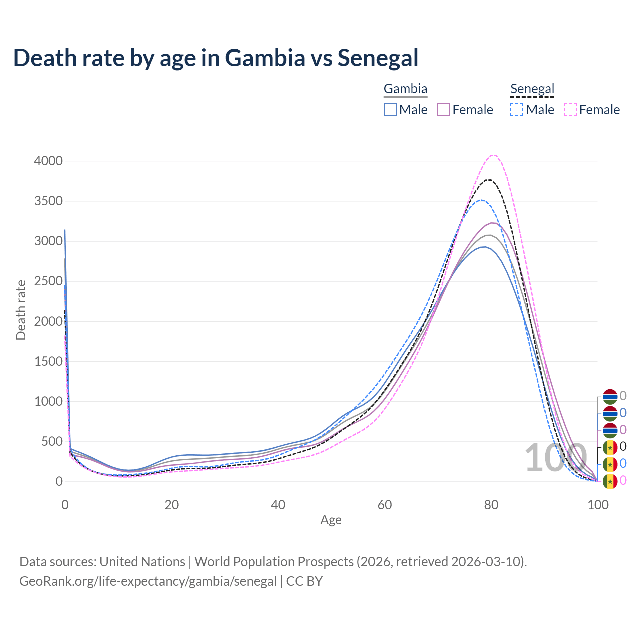 This life expectancy calculator shows the odds of living to 100, 95, 90, and below based on current age for both males and females in the Gambia and Senegal, along with mean and median age of death. The calculations are based on the 2026 life tables (actuarial tables) from the UN World Population Prospects.