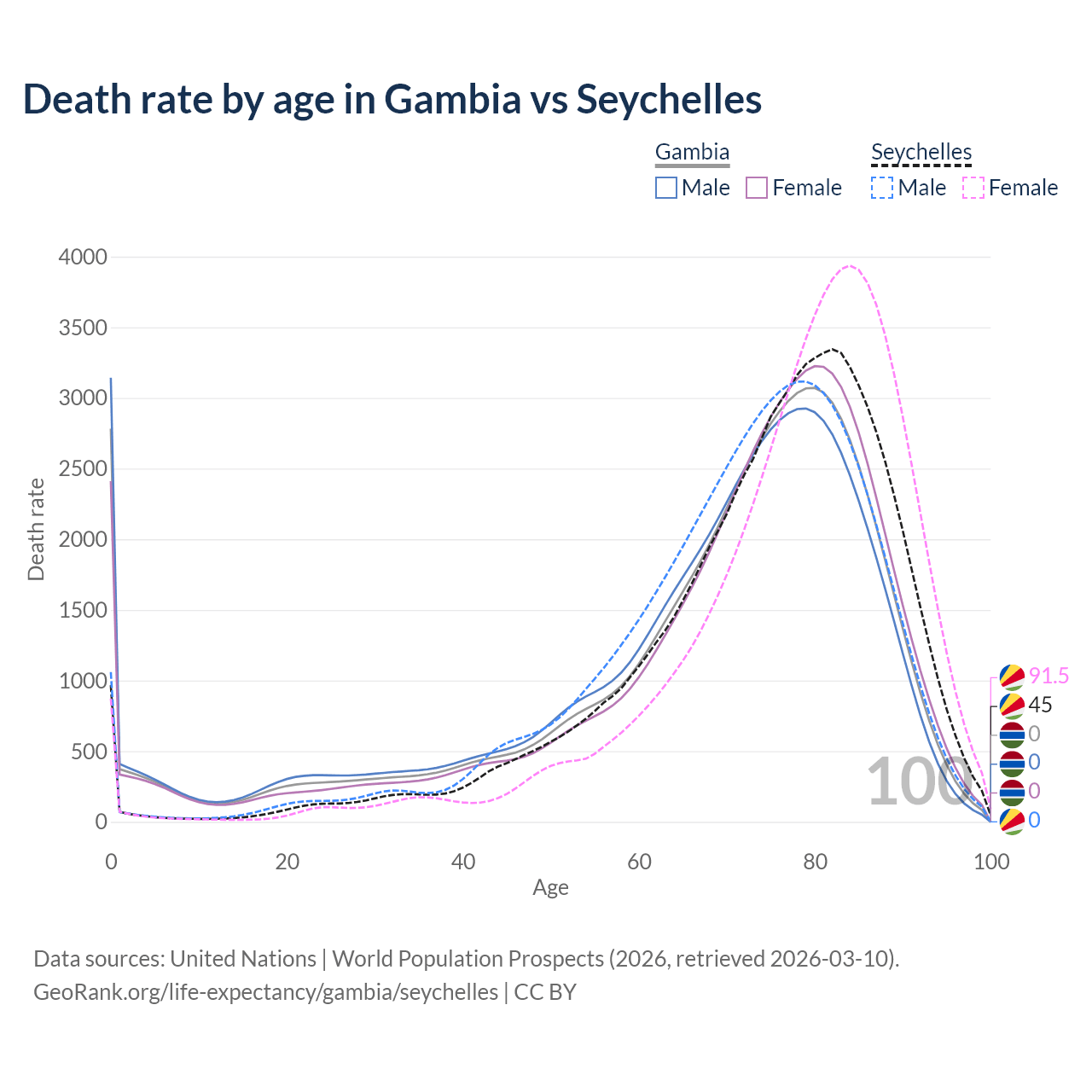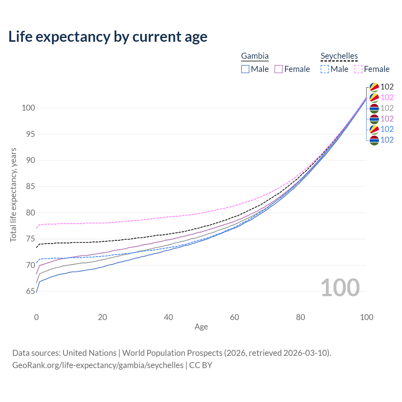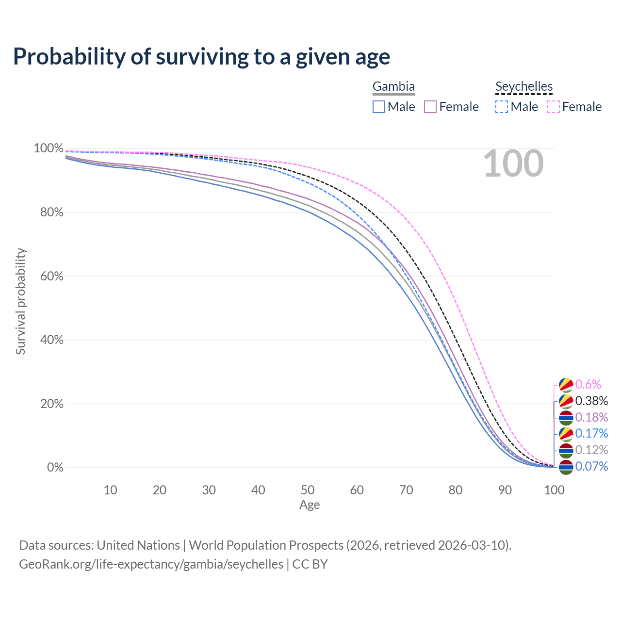 This life expectancy calculator shows the odds of living to 100, 95, 90, and below based on current age for both males and females in the Gambia and the Seychelles, along with mean and median age of death. The calculations are based on the 2026 life tables (actuarial tables) from the UN World Population Prospects.