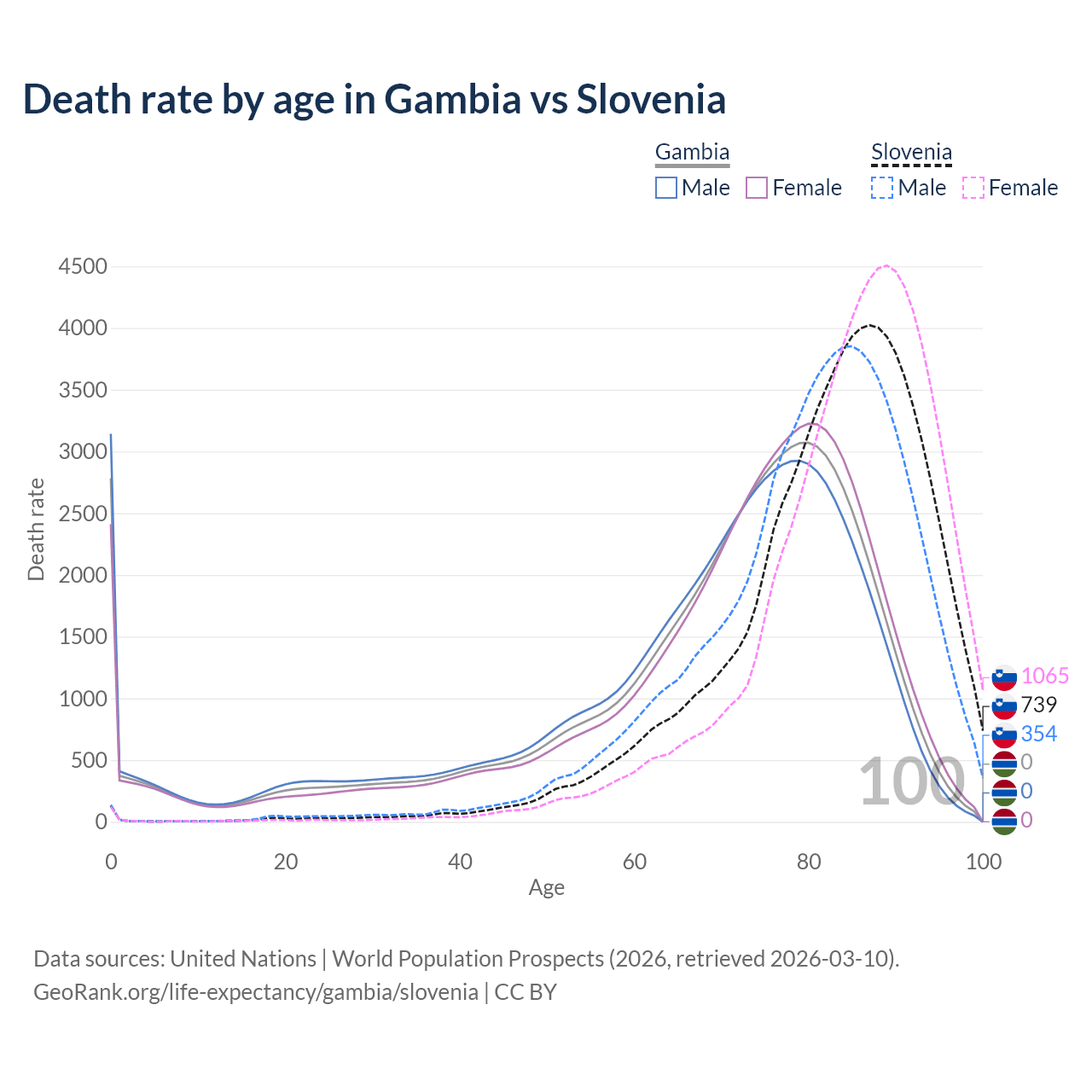 In the Gambia, the most common age of death is 80, compared to 87 in Slovenia. The median age of death is 73.4 in the Gambia and 84.4 in Slovenia, meaning only half of each cohort is expected to live past that age.