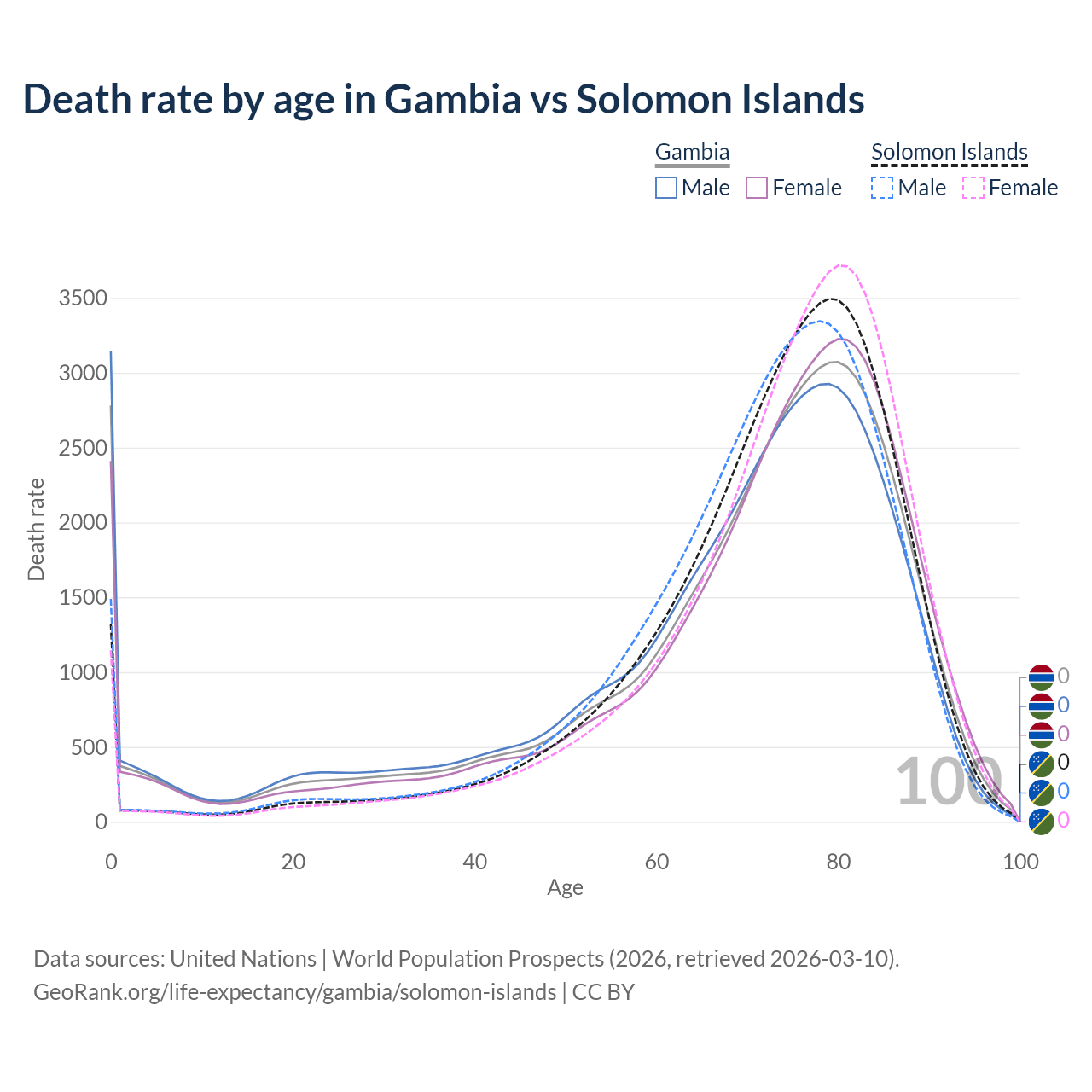 In the Gambia, the most common age of death is 80, compared to 79 in the Solomon Islands. The median age of death is 73.4 in the Gambia and 74.9 in the Solomon Islands, meaning only half of each cohort is expected to live past that age.