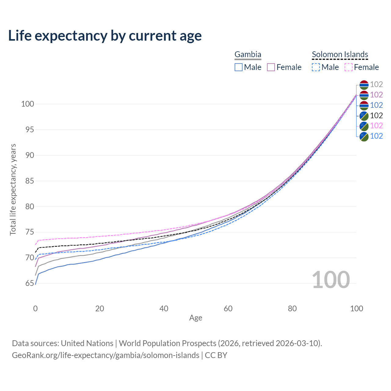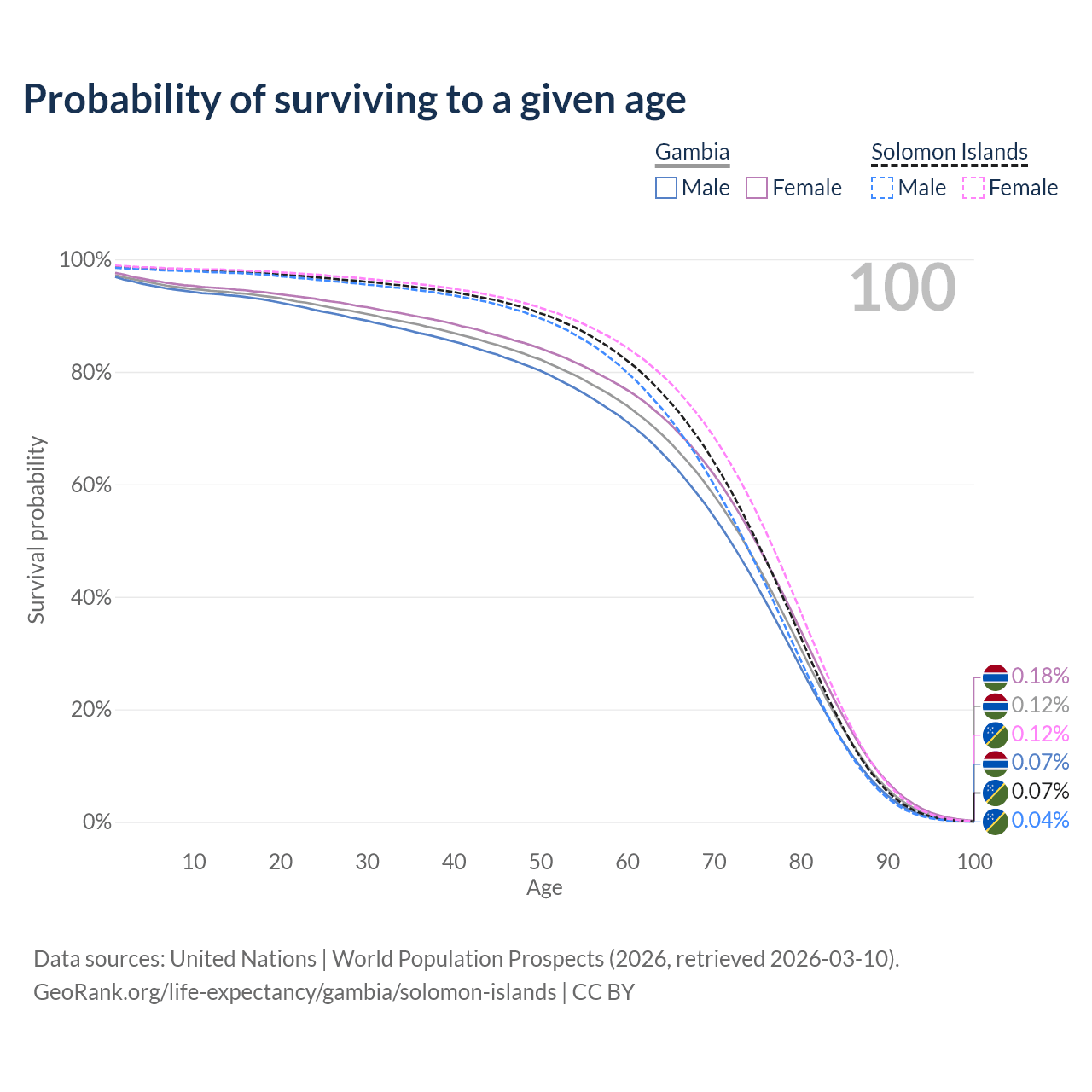 This life expectancy calculator shows the odds of living to 100, 95, 90, and below based on current age for both males and females in the Gambia and the Solomon Islands, along with mean and median age of death. The calculations are based on the 2026 life tables (actuarial tables) from the UN World Population Prospects.