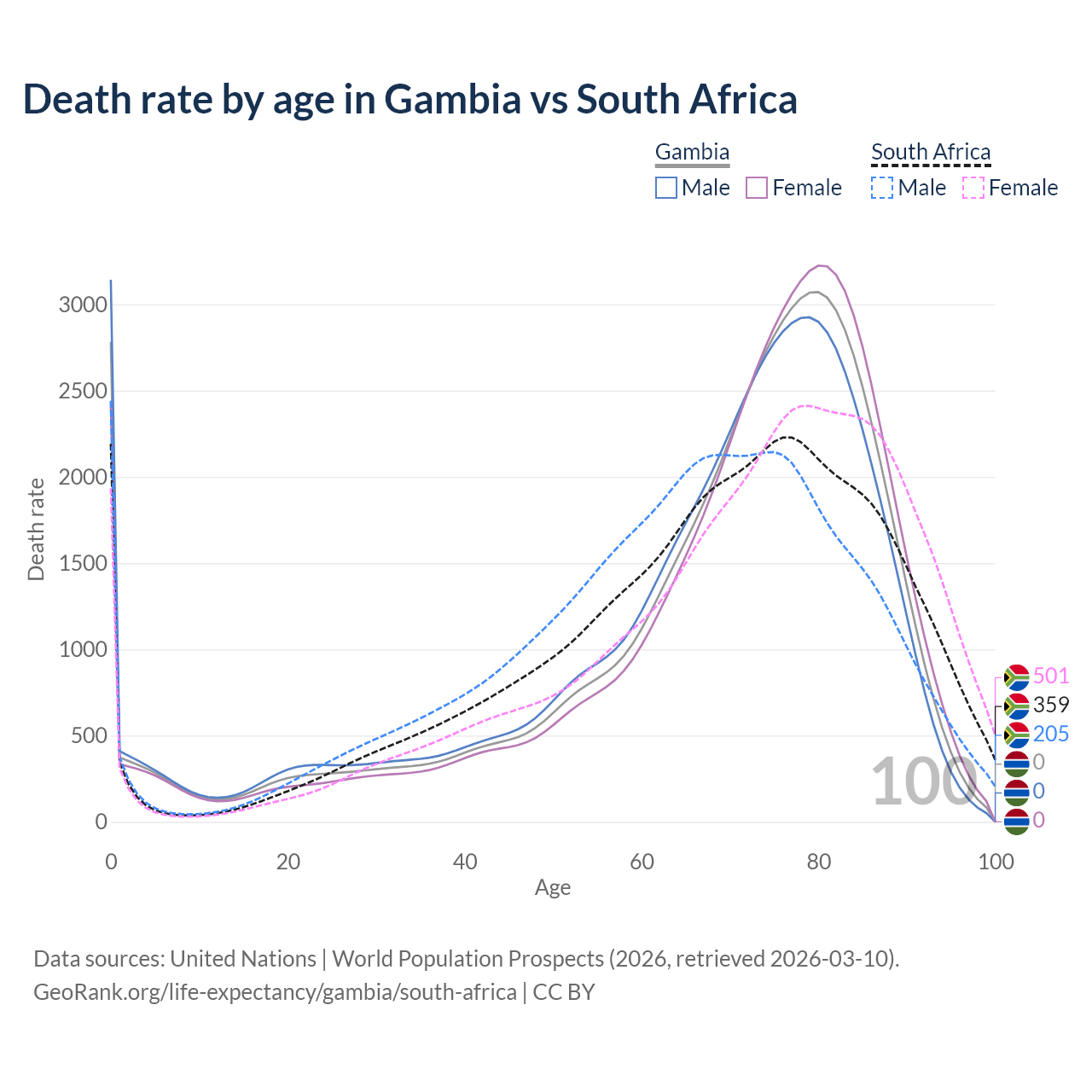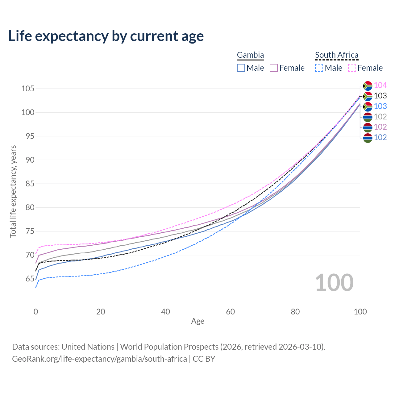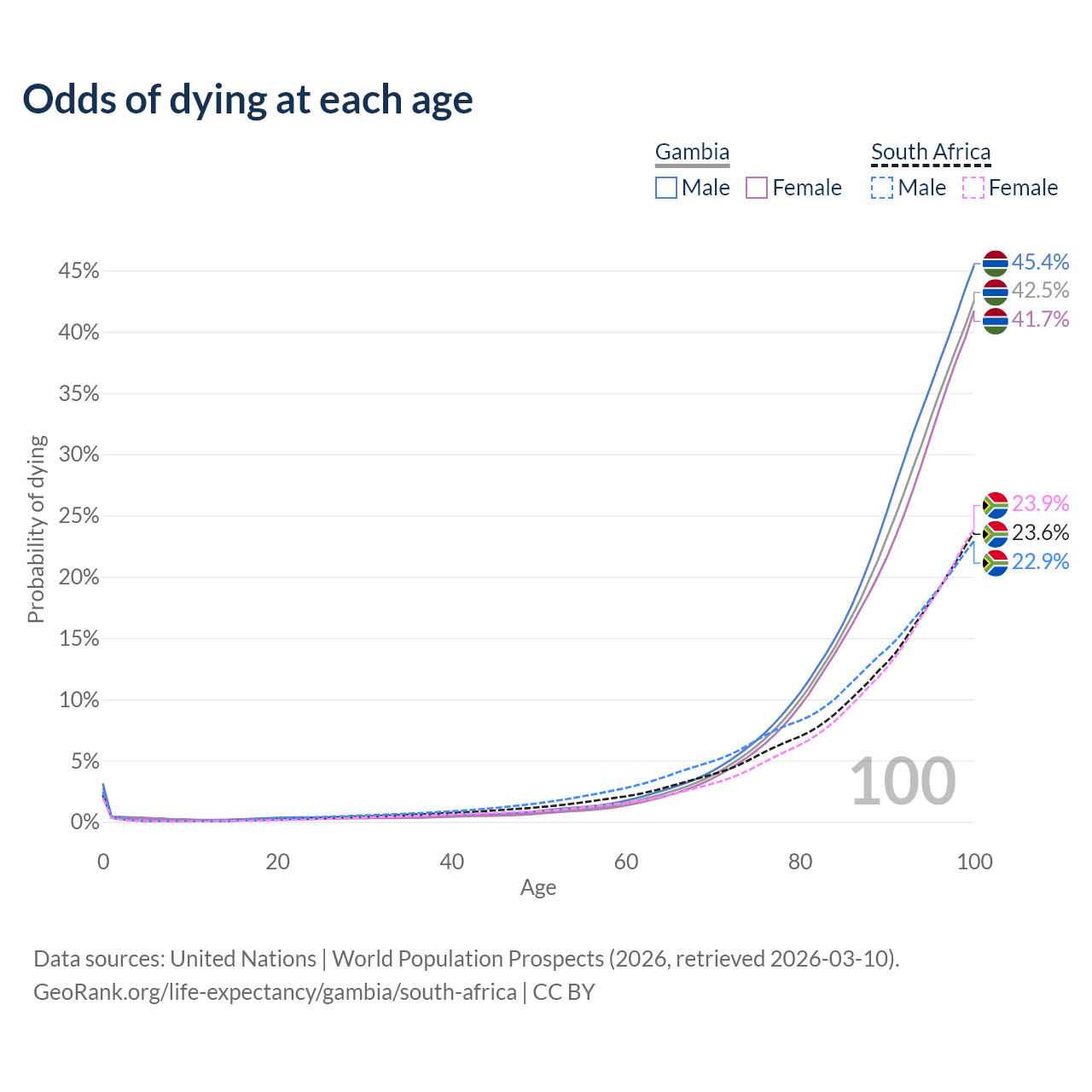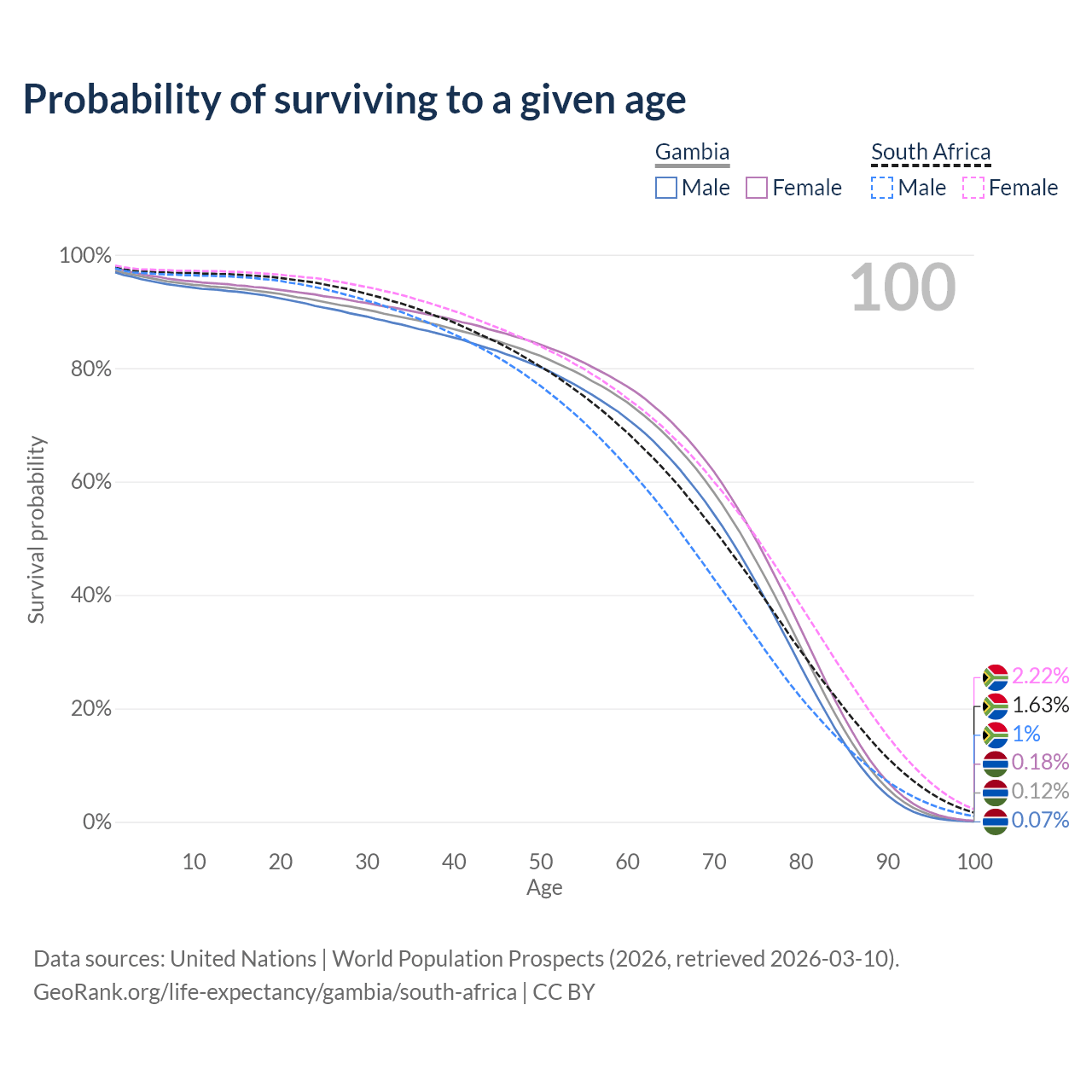 This life expectancy calculator shows the odds of living to 100, 95, 90, and below based on current age for both males and females in the Gambia and South Africa, along with mean and median age of death. The calculations are based on the 2026 life tables (actuarial tables) from the UN World Population Prospects.