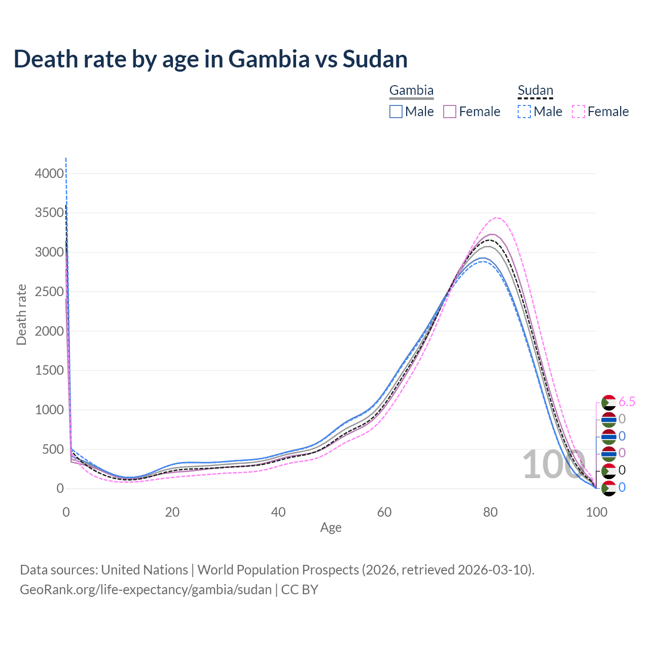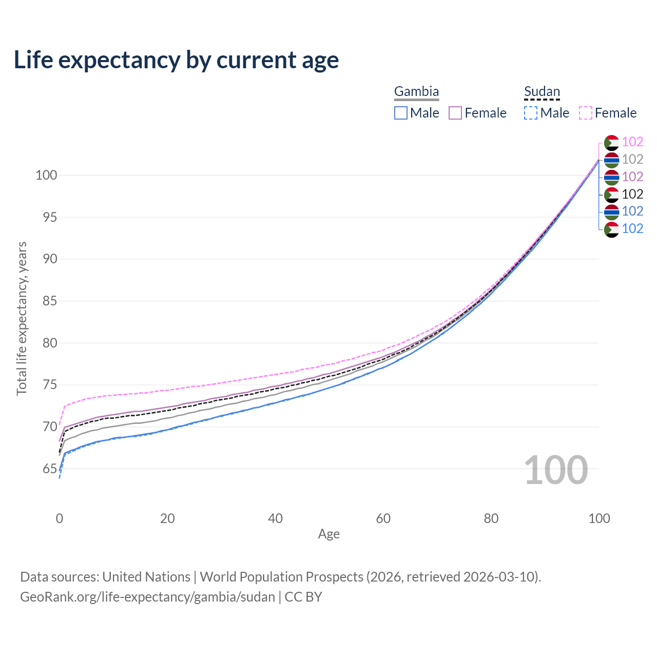 The average life expectancy at birth is 66.5 years in the Gambia vs 66.9 in Sudan. The Gambia is ranked 167/197 by life expectancy, and Sudan is 160/197. In the Gambia, the life expectancy is 64.7 years for males and 68.2 years for females. In Sudan, it's 63.8 years for males and 70.2 years for females.