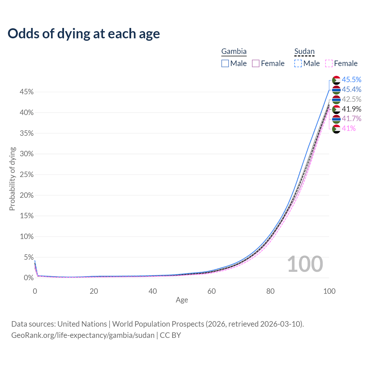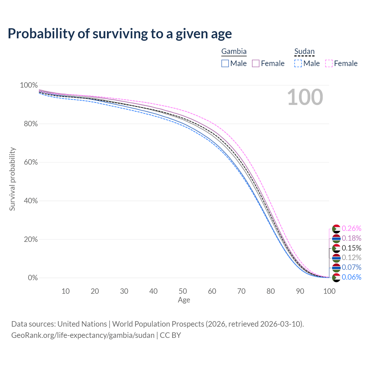 This life expectancy calculator shows the odds of living to 100, 95, 90, and below based on current age for both males and females in the Gambia and Sudan, along with mean and median age of death. The calculations are based on the 2026 life tables (actuarial tables) from the UN World Population Prospects.