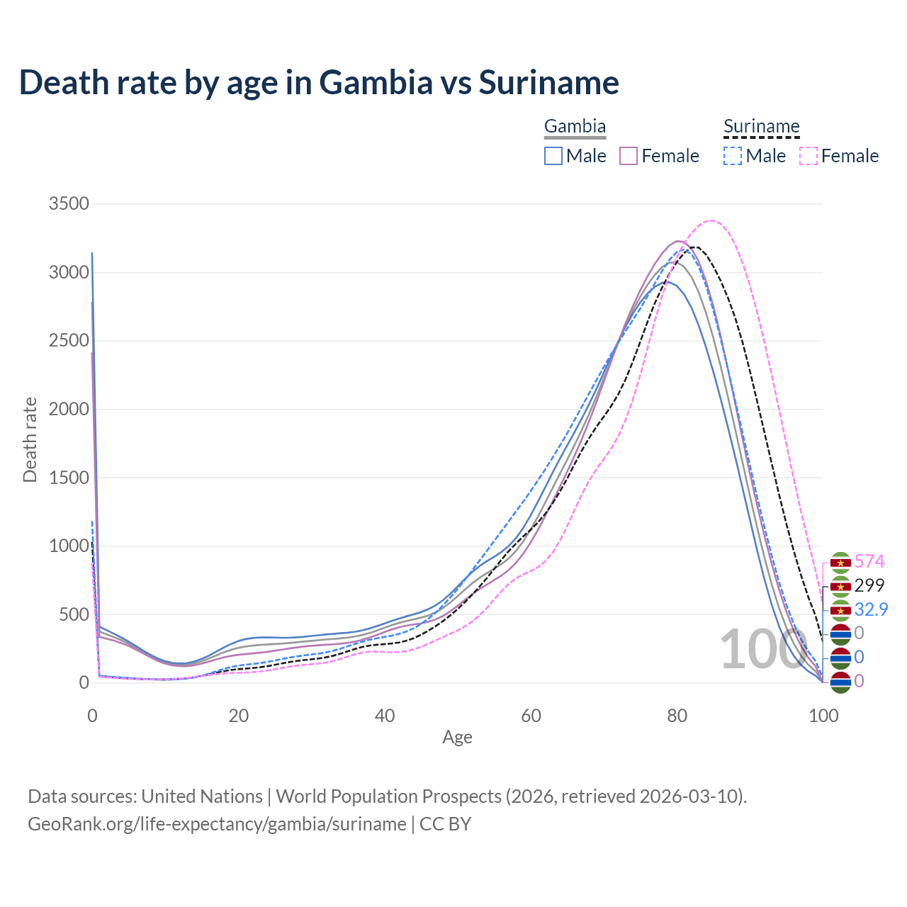 This life expectancy calculator shows the odds of living to 100, 95, 90, and below based on current age for both males and females in the Gambia and Suriname, along with mean and median age of death. The calculations are based on the 2026 life tables (actuarial tables) from the UN World Population Prospects.