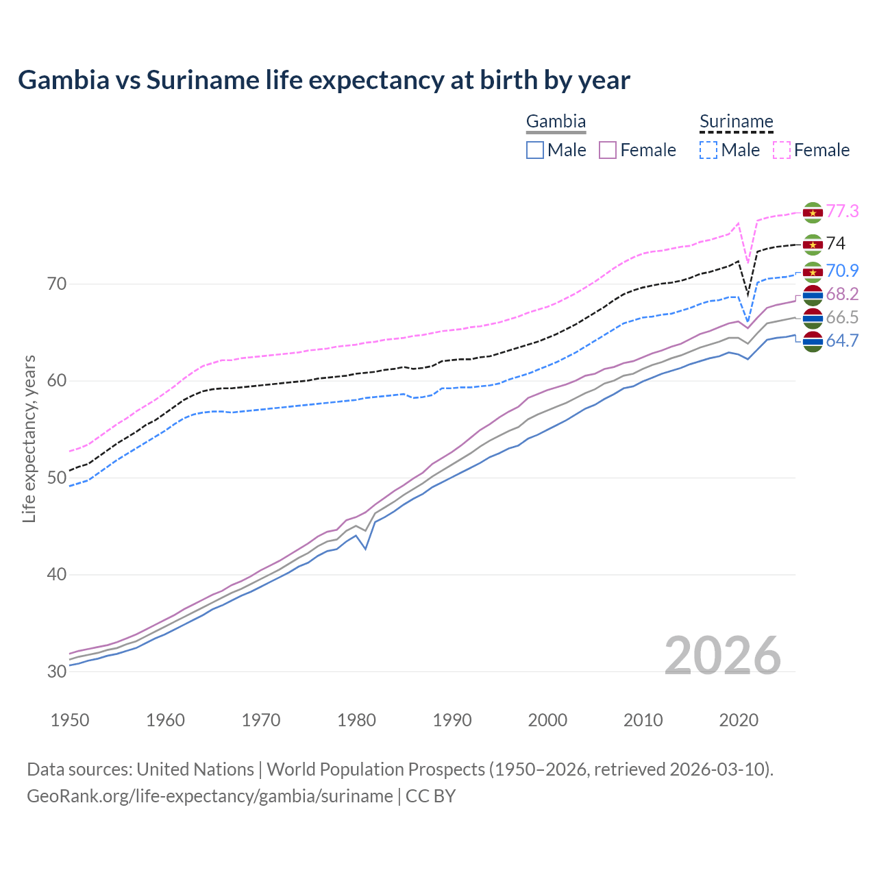 GeoRank.org/life-expectancy/gambia/suriname | CC BY