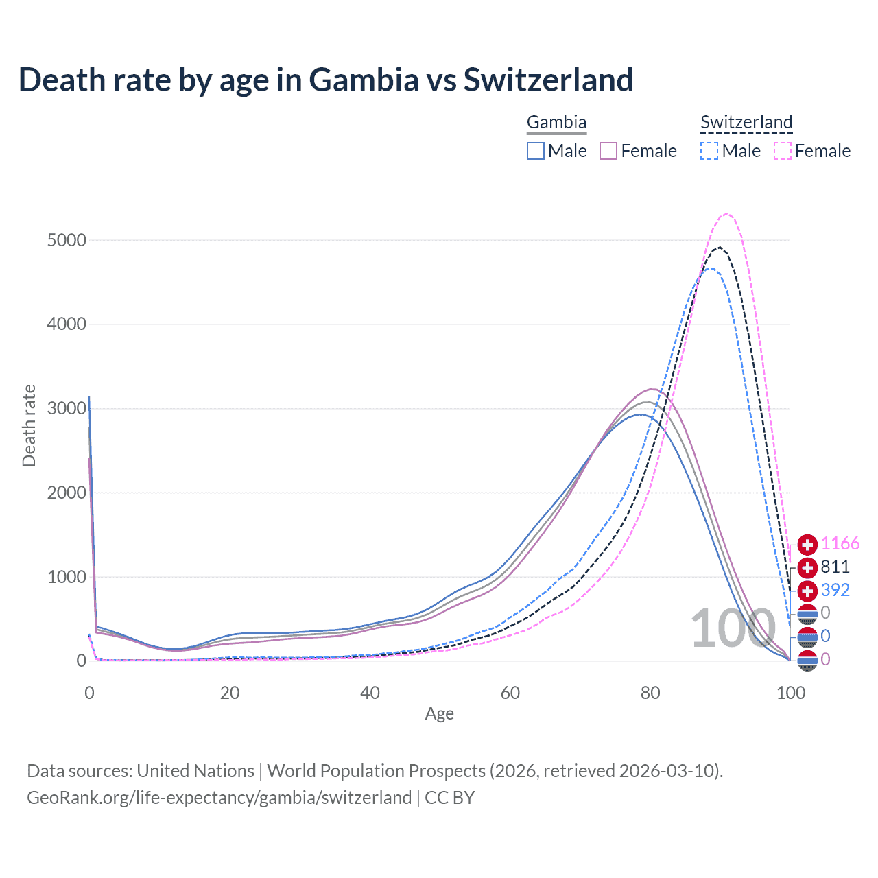 In the Gambia, the most common age of death is 80, compared to 90 in Switzerland. The median age of death is 73.4 in the Gambia and 87.2 in Switzerland, meaning only half of each cohort is expected to live past that age.