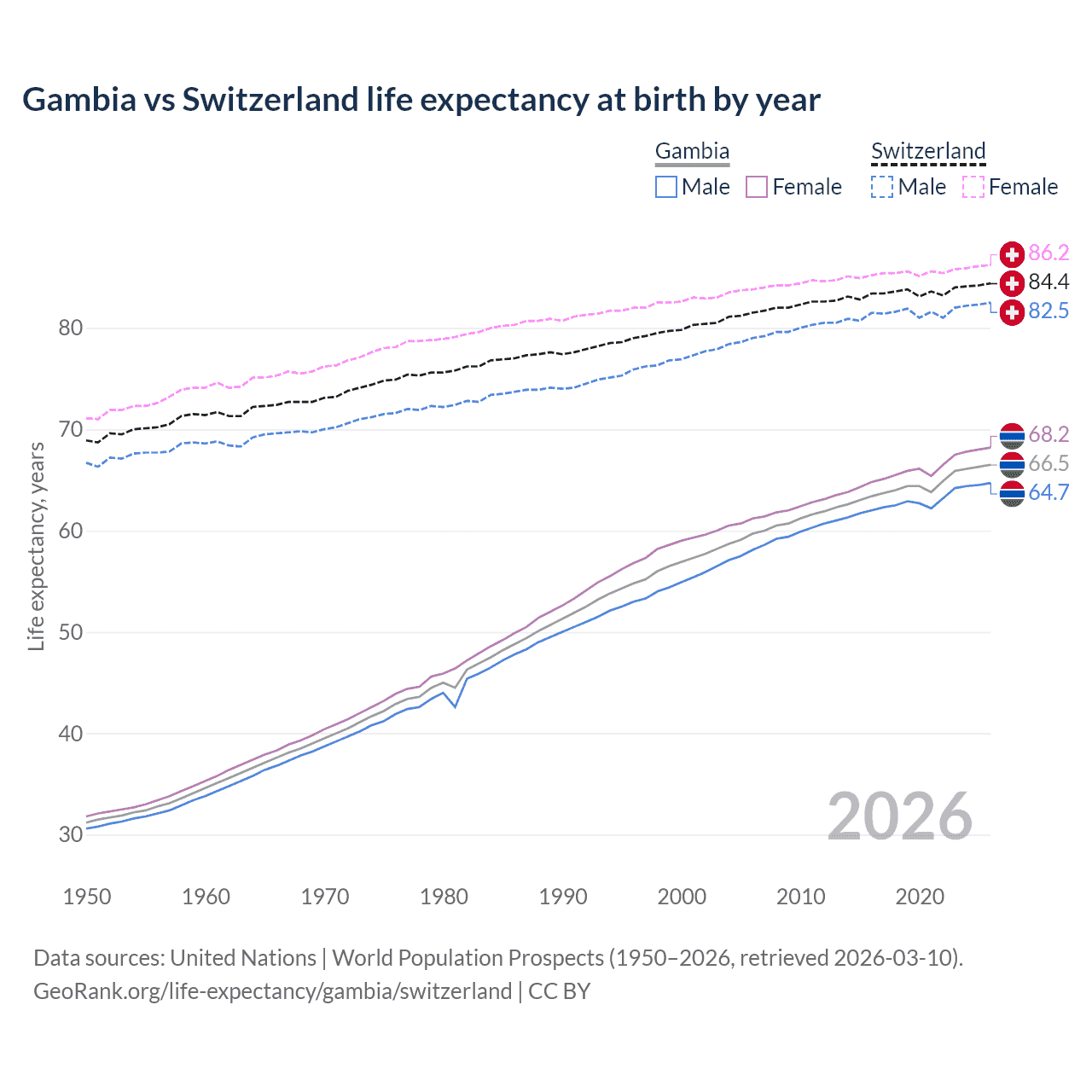 The average life expectancy at birth is 66.5 years in the Gambia vs 84.4 in Switzerland. The Gambia is ranked 167/197 by life expectancy, and Switzerland is 6/197. In the Gambia, the life expectancy is 64.7 years for males and 68.2 years for females. In Switzerland, it's 82.5 years for males and 86.2 years for females.