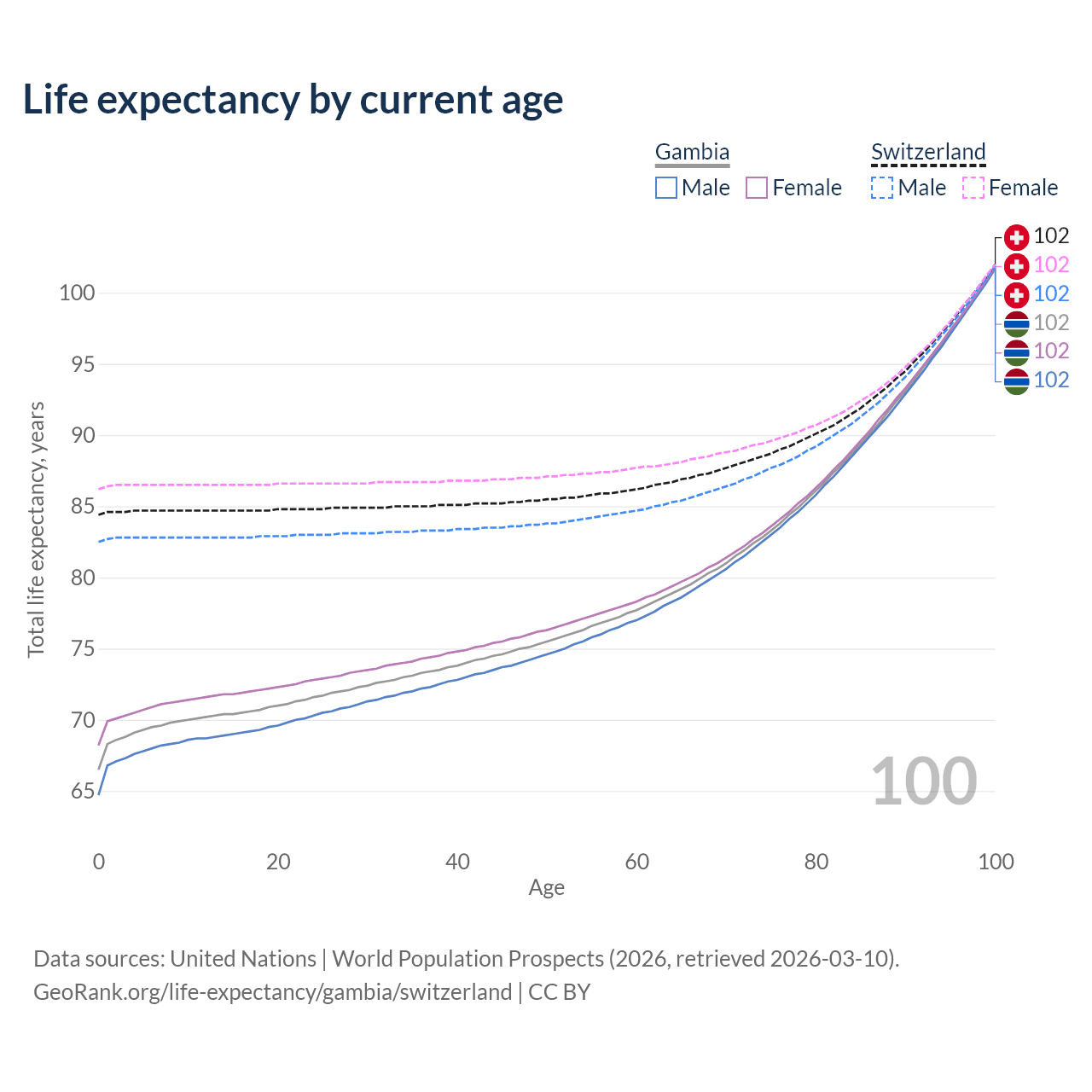 This life expectancy calculator shows the odds of living to 100, 95, 90, and below based on current age for both males and females in the Gambia and Switzerland, along with mean and median age of death. The calculations are based on the 2026 life tables (actuarial tables) from the UN World Population Prospects.