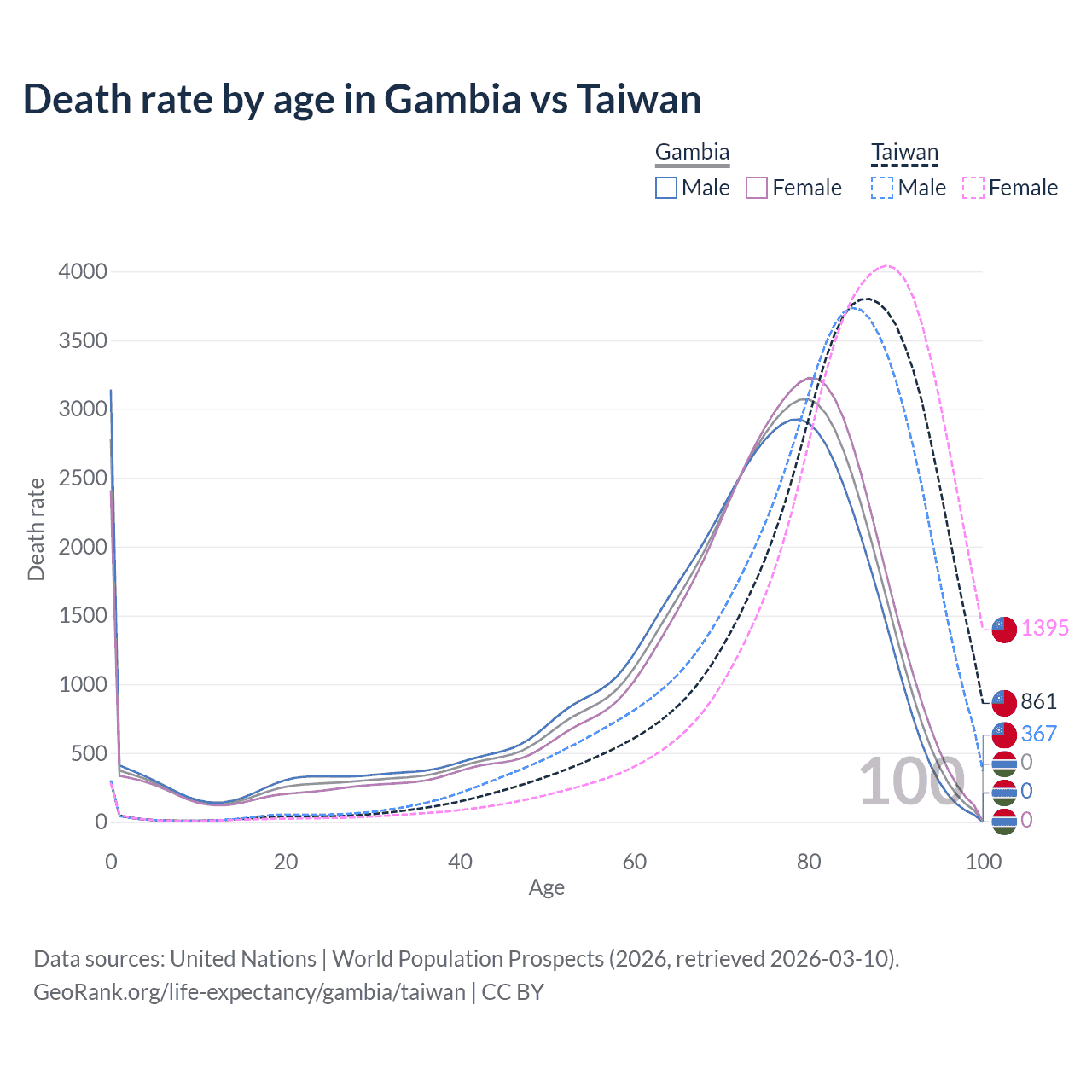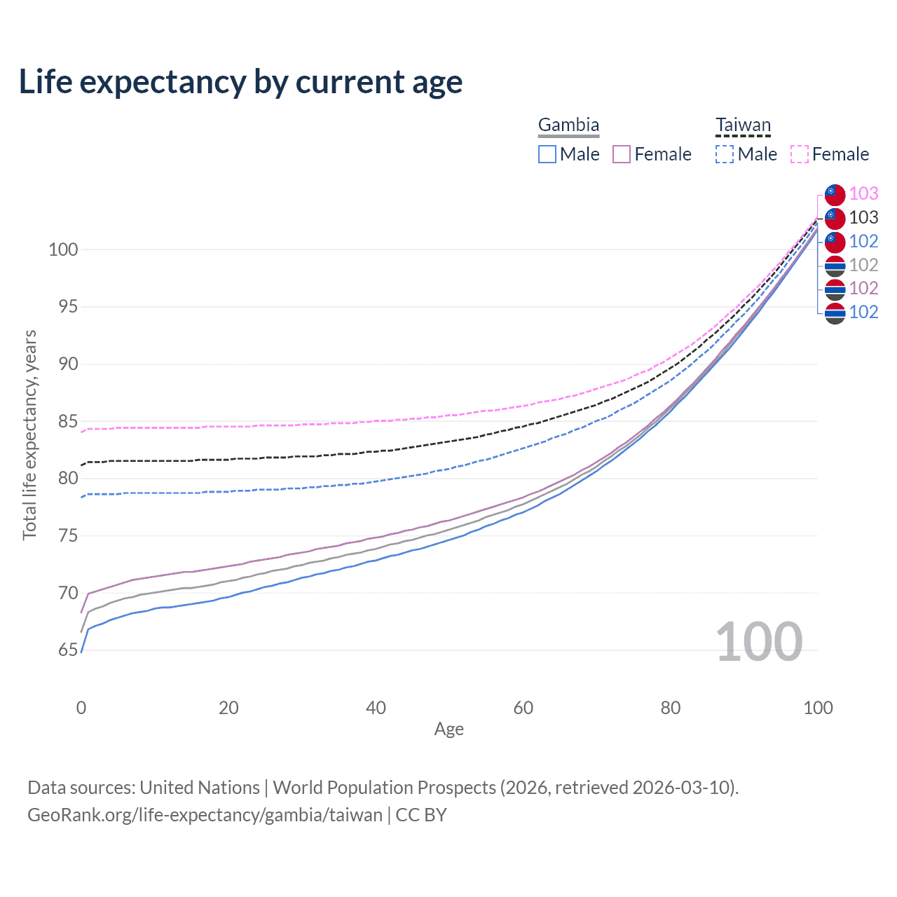 This life expectancy calculator shows the odds of living to 100, 95, 90, and below based on current age for both males and females in the Gambia and Taiwan, along with mean and median age of death. The calculations are based on the 2026 life tables (actuarial tables) from the UN World Population Prospects.