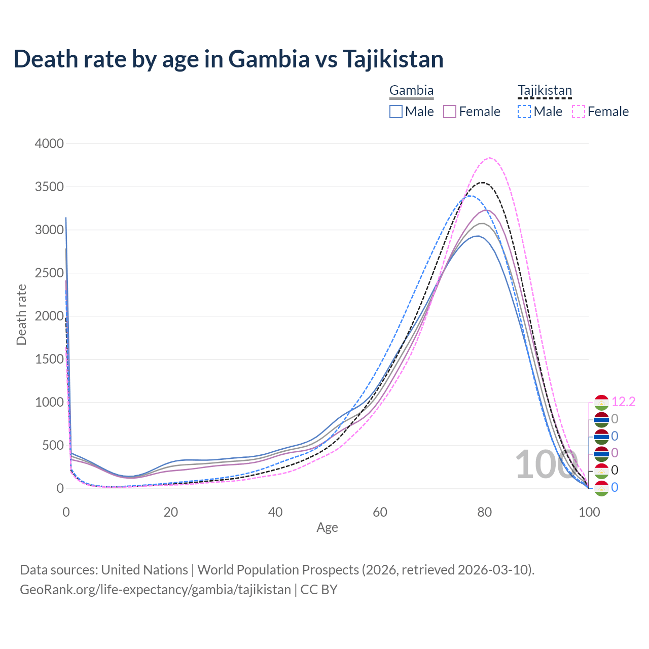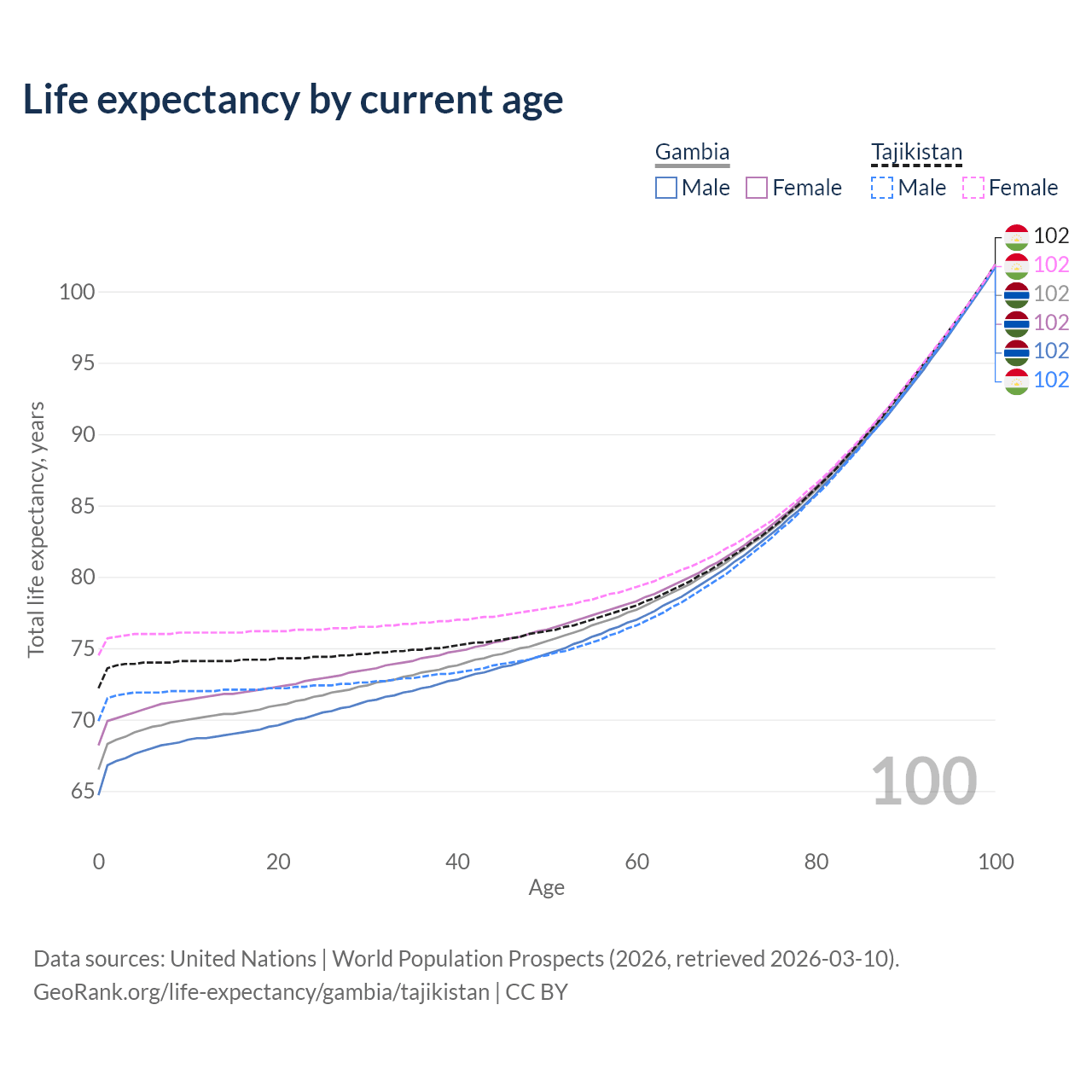 This life expectancy calculator shows the odds of living to 100, 95, 90, and below based on current age for both males and females in the Gambia and Tajikistan, along with mean and median age of death. The calculations are based on the 2026 life tables (actuarial tables) from the UN World Population Prospects.