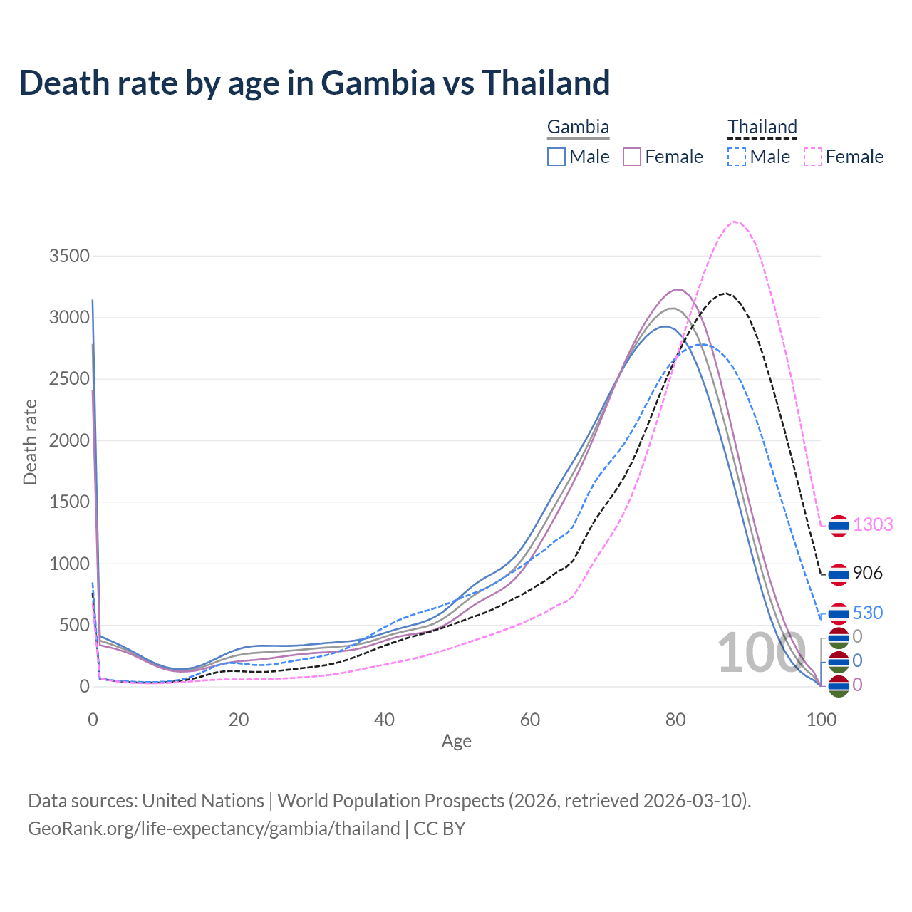 In the Gambia, the most common age of death is 80, compared to 87 in Thailand. The median age of death is 73.4 in the Gambia and 81.8 in Thailand, meaning only half of each cohort is expected to live past that age.