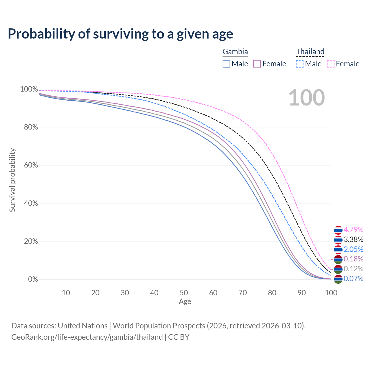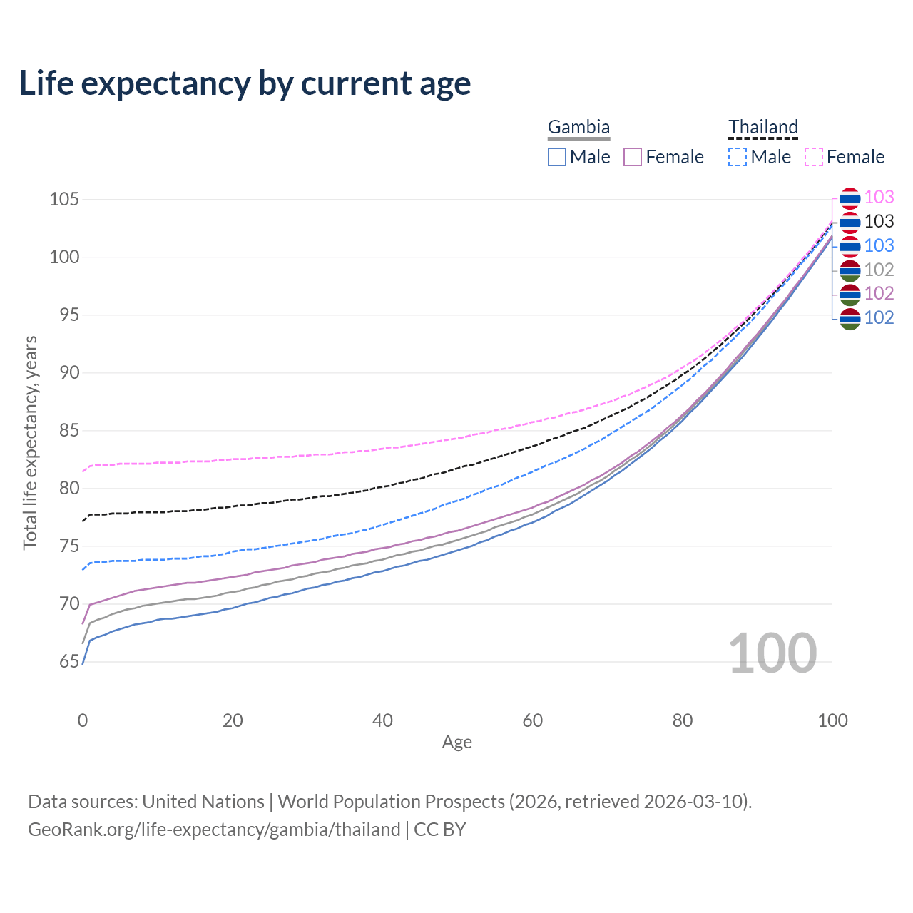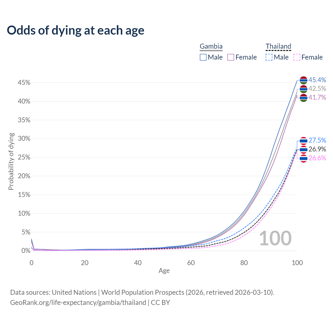 This life expectancy calculator shows the odds of living to 100, 95, 90, and below based on current age for both males and females in the Gambia and Thailand, along with mean and median age of death. The calculations are based on the 2026 life tables (actuarial tables) from the UN World Population Prospects.