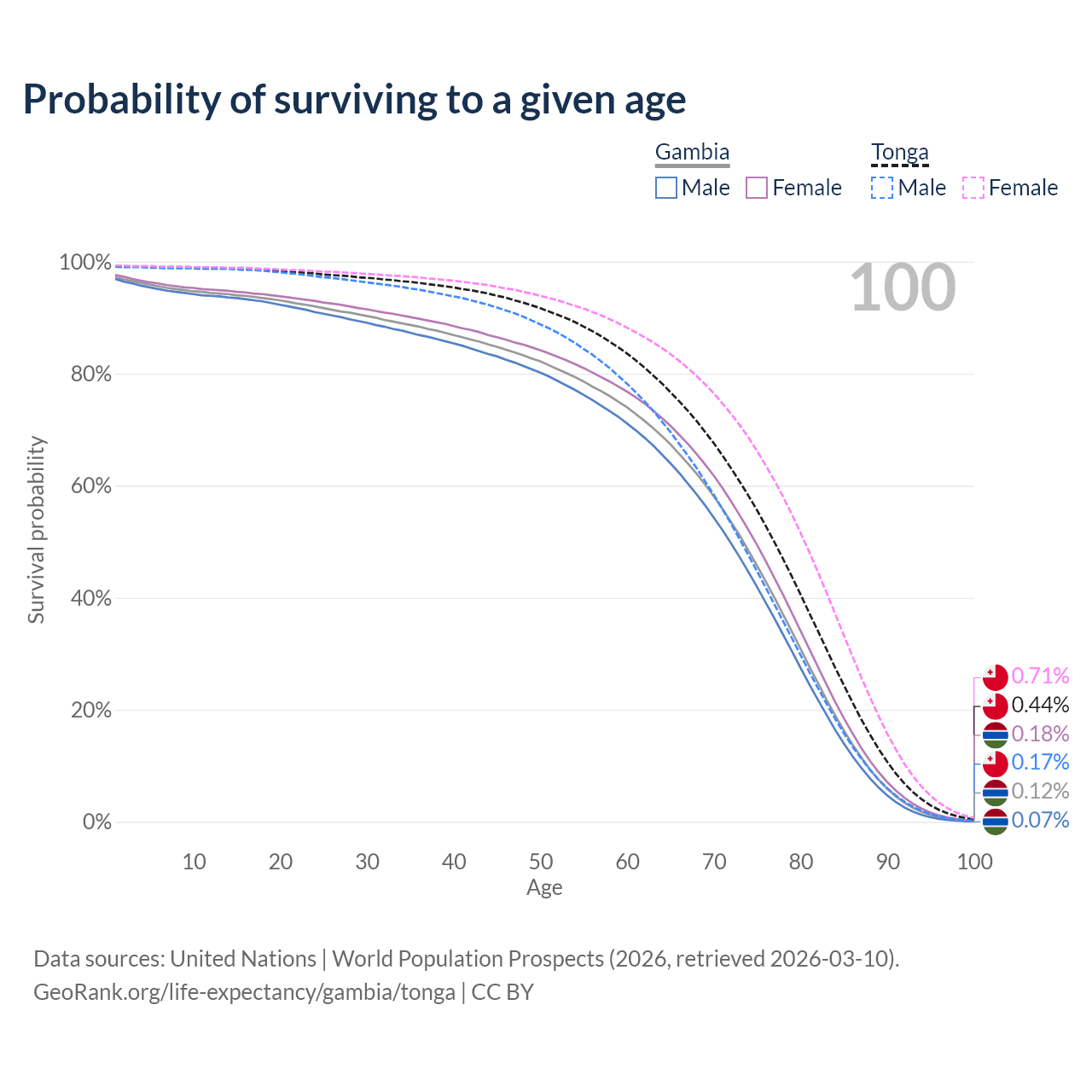 This life expectancy calculator shows the odds of living to 100, 95, 90, and below based on current age for both males and females in the Gambia and Tonga, along with mean and median age of death. The calculations are based on the 2026 life tables (actuarial tables) from the UN World Population Prospects.