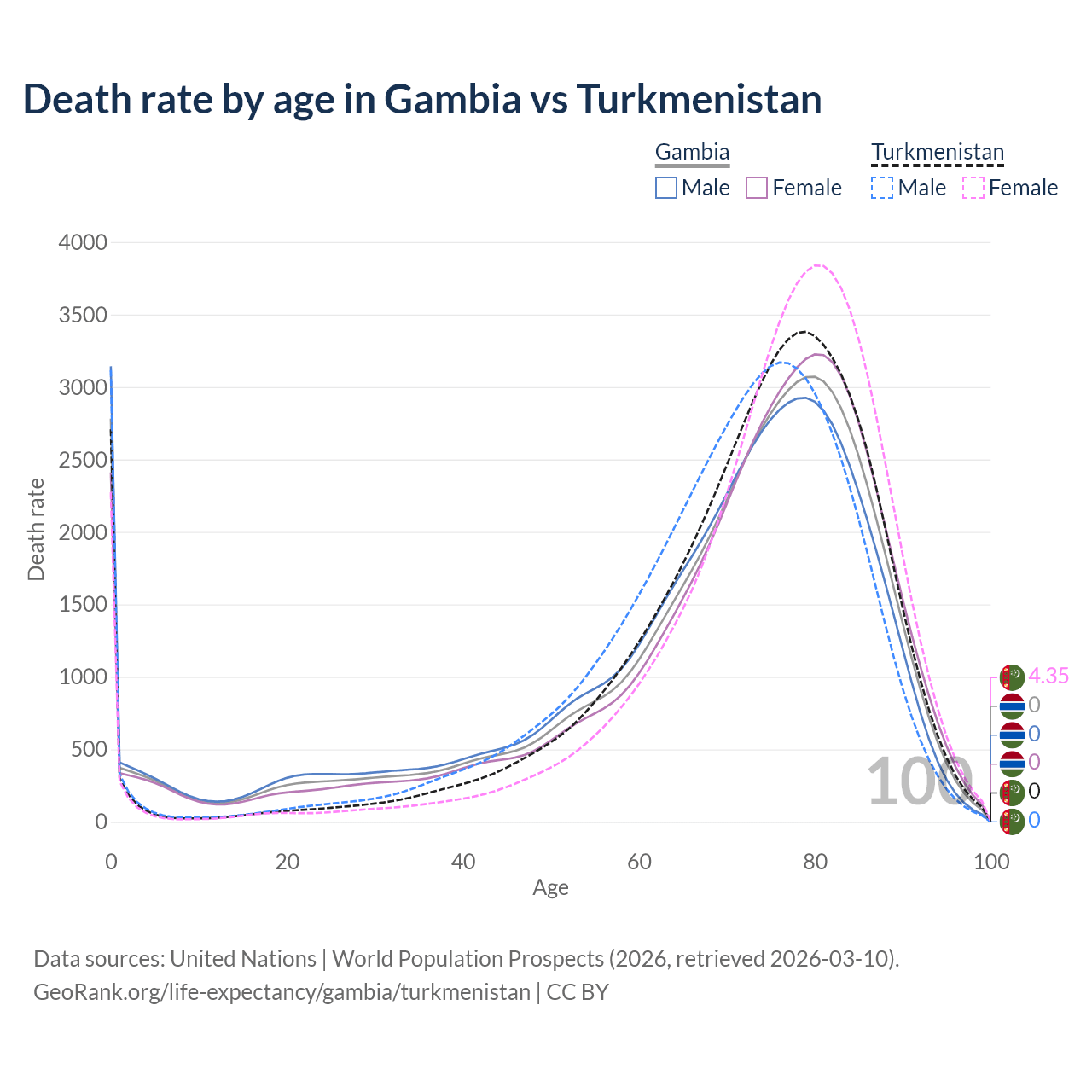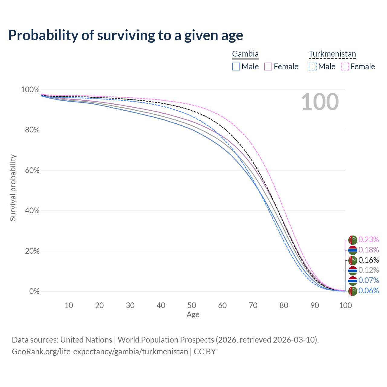 This life expectancy calculator shows the odds of living to 100, 95, 90, and below based on current age for both males and females in the Gambia and Turkmenistan, along with mean and median age of death. The calculations are based on the 2026 life tables (actuarial tables) from the UN World Population Prospects.